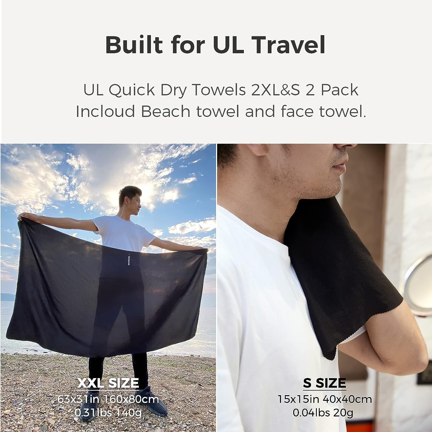 - GREAT BACKPACKING TRAVEL ACCESSORY - UL Quick Dry Towels 2XL&S 2 Pack only weighs 160g(0.35lbs), Incloud ①XXL(SIZE: 63x31in 160x80cm / PACKED SIZE : 3.5x2x4.5in 9x5x11.5cm), Equal in size to a standard beach towel. ②S(SIZE 15x15in 40x40cm / PACKED SIZE : 1.7x1x2.5in 4.3x2.7x6.5cm), Suit as face towel. It is great for outdoor, hiking, camping.