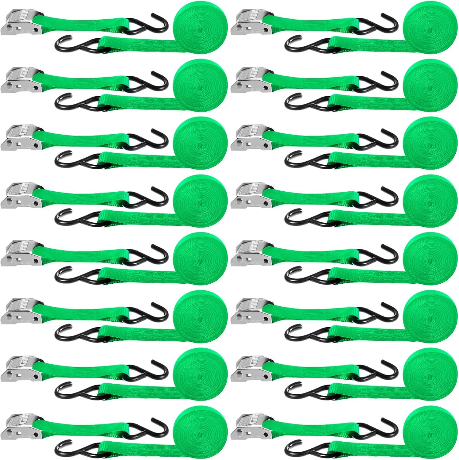 16 Pcs Cambuckle Tie Down Straps 1763lbs Break Strength Securing Straps 1'' x 15 ft Cambuckle Tie Downs with S Hook for Motorcycle, Kayak, Car, Truck, Boat Moving, Securing Cargo(Green)