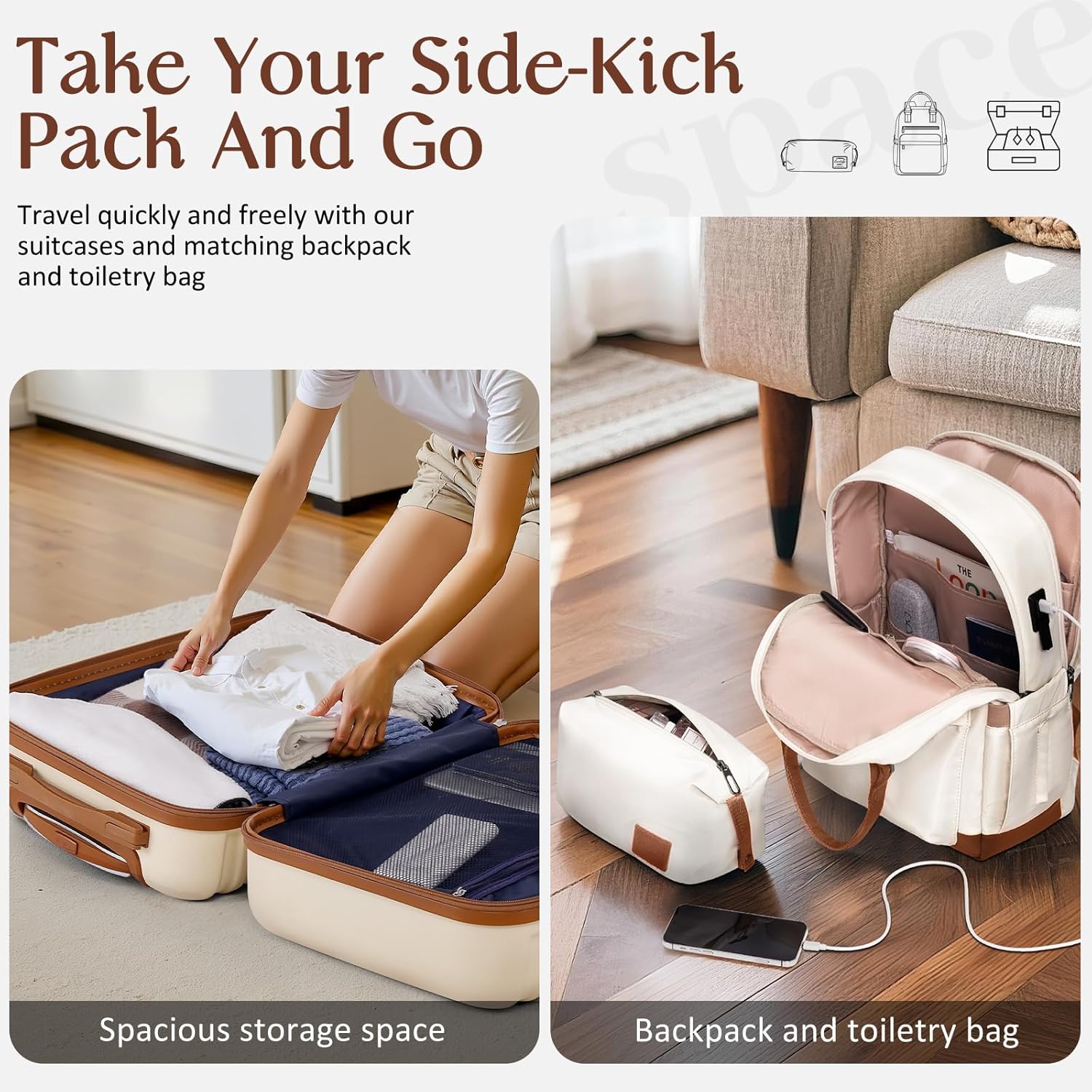 - Five piece set offers a 20’’ luggage, a 24’’ luggage, a 28’’ luggage, a weekender travel bag and a toiletry bag. Three piece sets offer two options. Option A includes a 20’’ luggage, a travel duffel bag and a toiletry bag. Option B includes a 20’’ luggage, a backpack and a toiletry bag