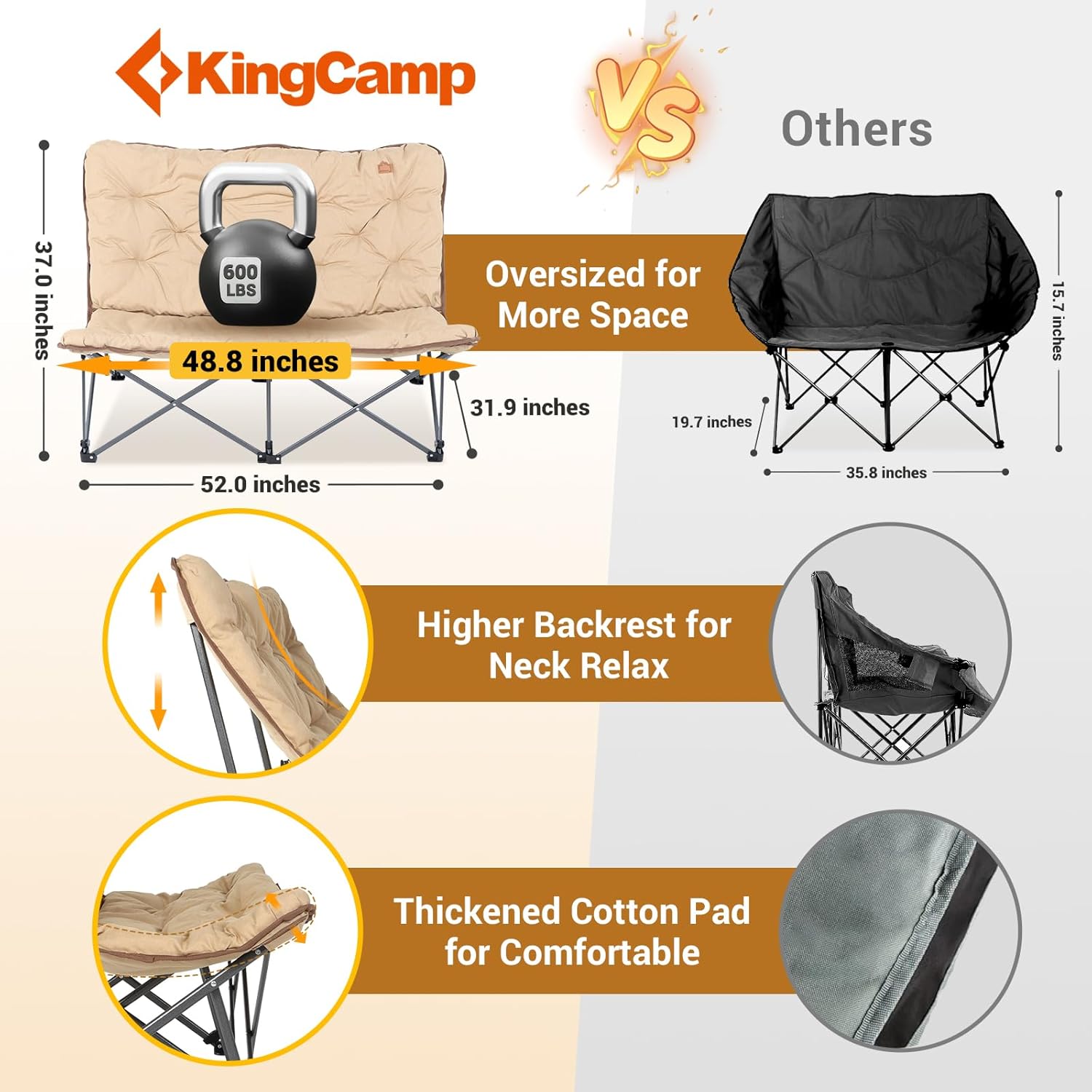 - 【Heavy-Duty Durability for Shared Use】Built to last through countless adventures together: 22mm steel frame and 600D reinforced Oxford fabric support up to 400lbs, ensuring stability for two adults. Perfect for tailgates, camping trips, backyard gatherings, or balcony chats—enjoy durable quality that keeps up with your shared moments.