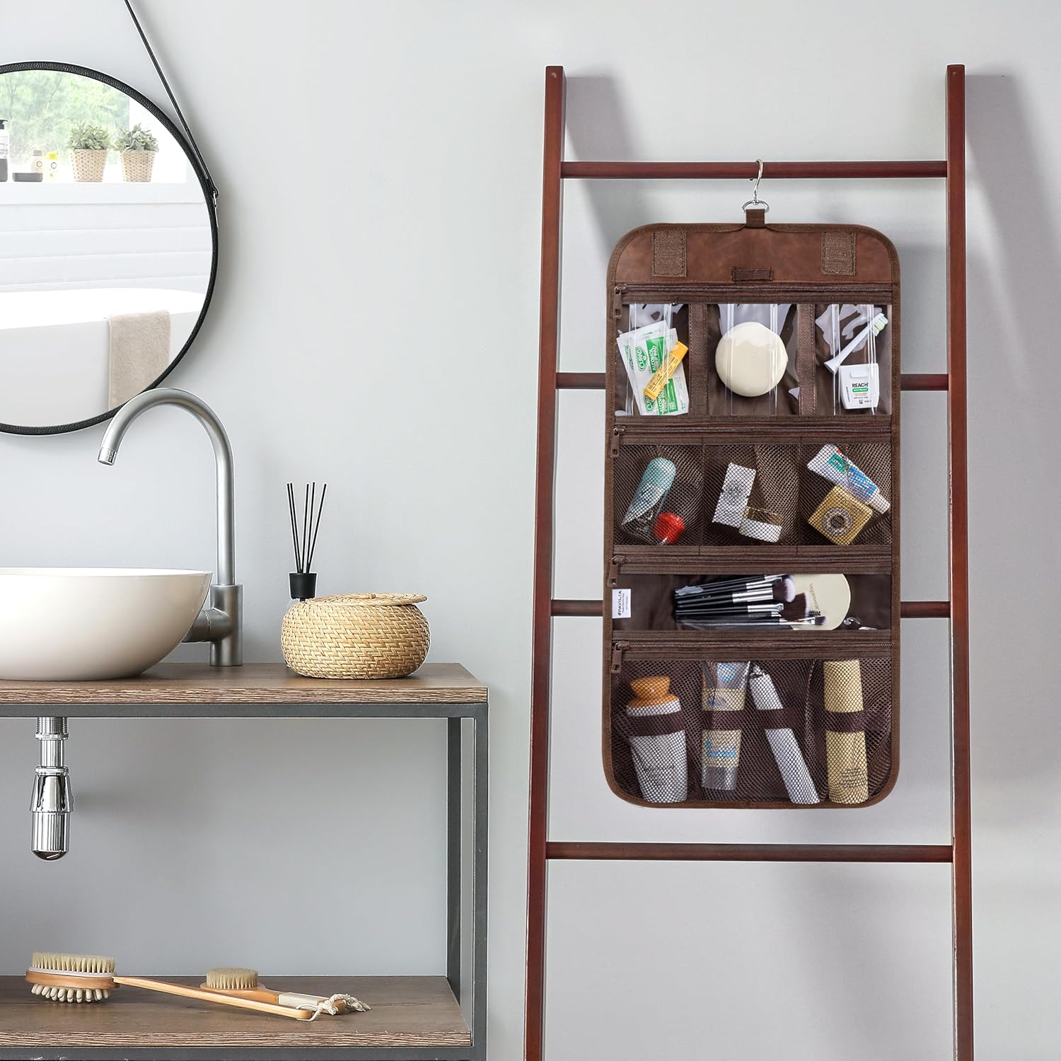 PAVILIA Hanging Toiletry Bag Men Women, Travel Kit Foldable Large Toiletries Organizer, Roll up Cosmetics Makeup Bag Accessories, Waterproof Essentials Dopp Case (Brown)