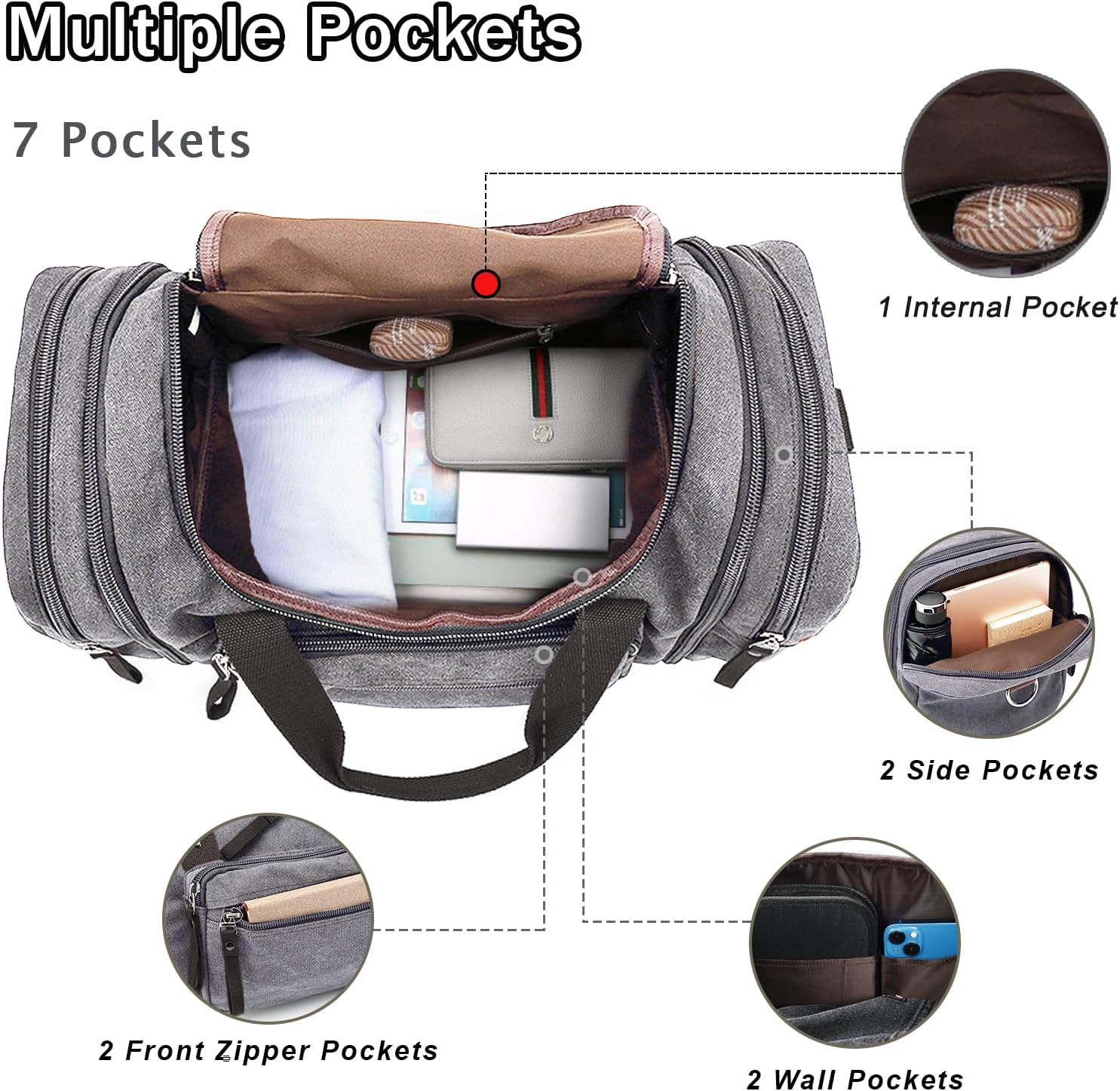 - 【Expandable Space】Felipe Varela duffle bag for men measures (L) 19.68 x (W) 9.4 x (H) 10.04 inches, and our carry on bag can be expanded up to 24.4 inches with two side zips. 7 zippered pockets include:1*main compartment, 1*large front zippered pocket, 1*small front zippered pocket, 2*side zippered pockets, 1*back zippered pocket, and 1*internal zippered pocket. This travel duffel bag with enough space for comfortable use