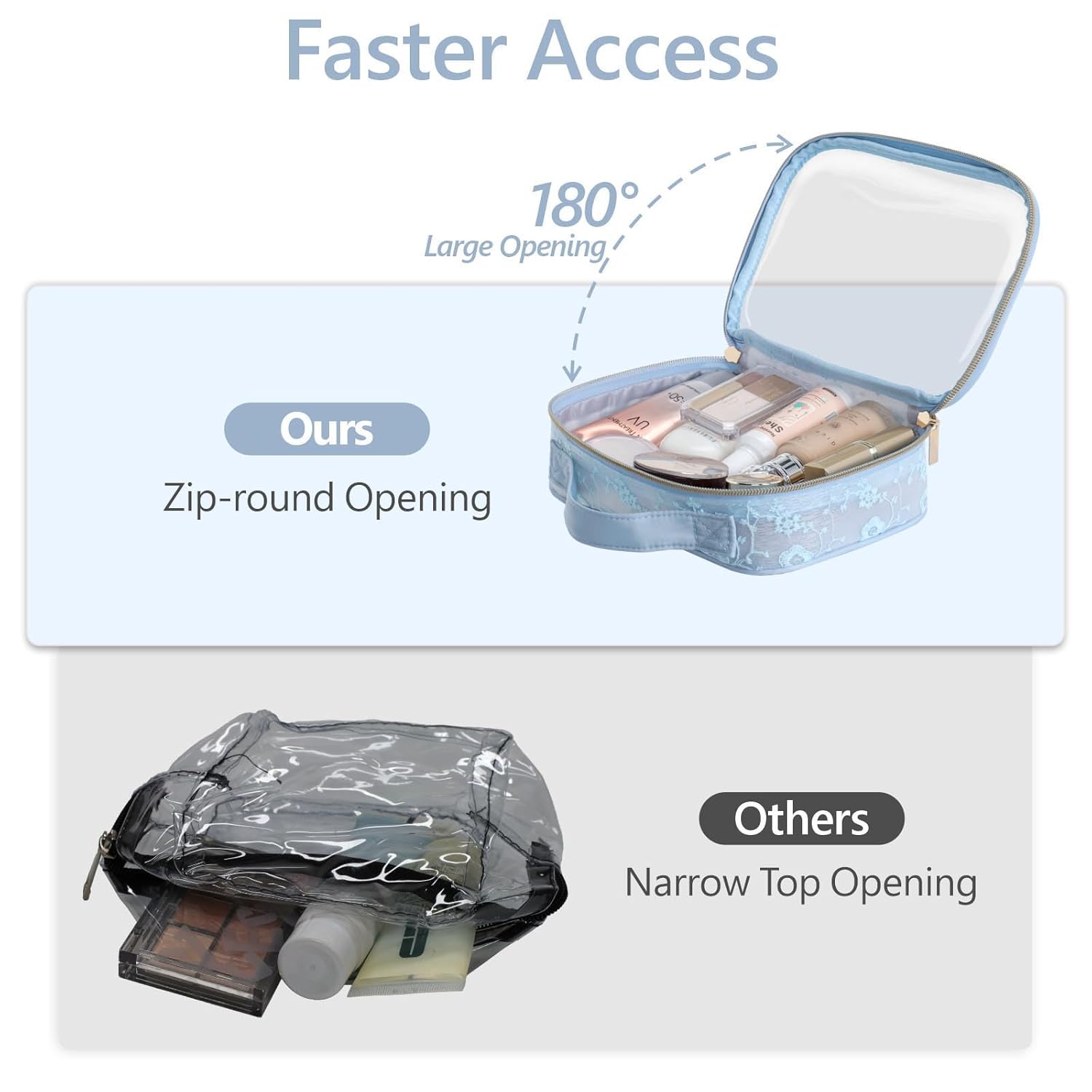 PACKISM Floral Texture Lace TSA Approved Toiletry Bag - 180° Large Opening Clear Makeup Bags in 2 Size, TSA Clear Toiletry Bag with Handle, 0.5 mm Thick Non-deformable No Smell, Blue