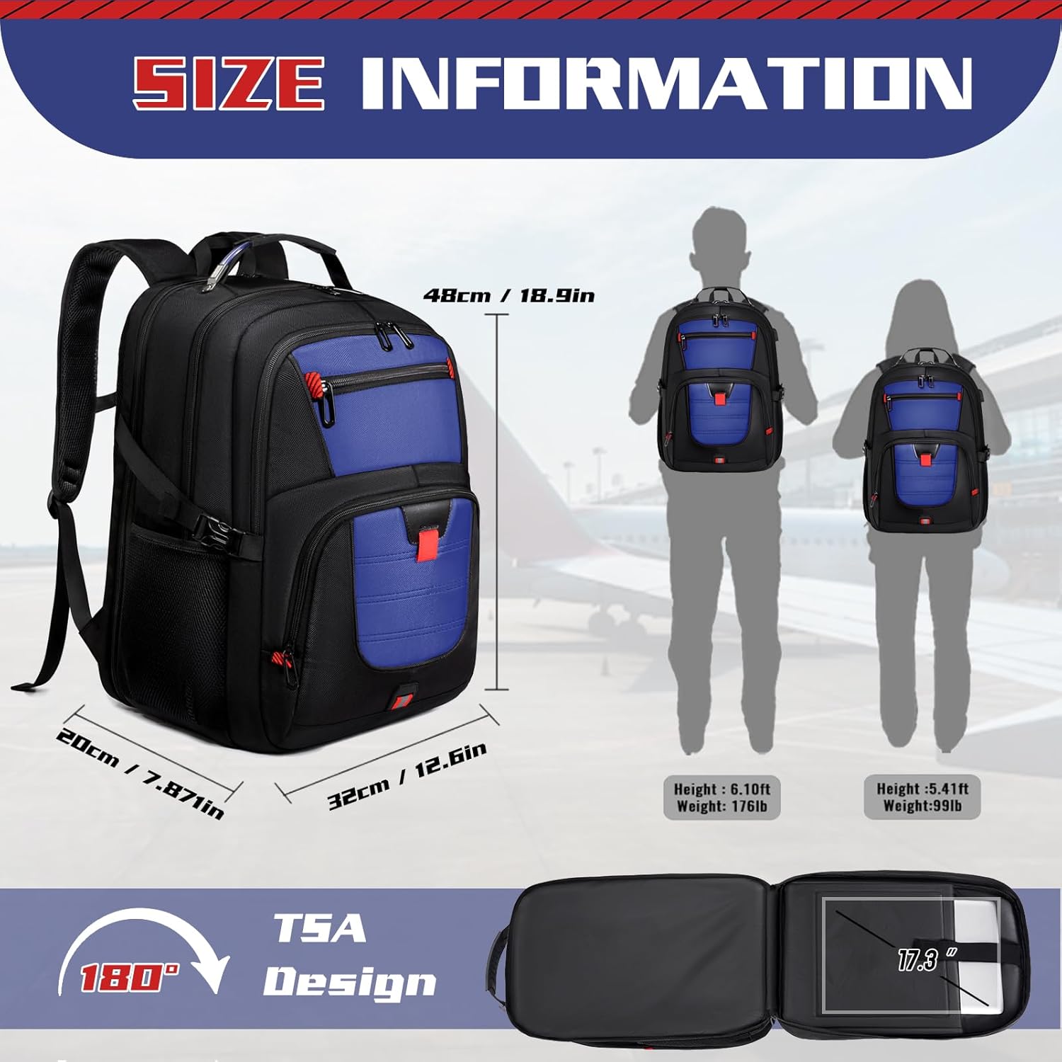 - âď¸ăLarge Capacity & Organizationă: Extra large Travel Laptop Backpack 50L Total more than 10 pockets. The big backpack has 3 spacious compartments, TSA compartment for 17.3 inch laptops, main compartment for coats, folders, travel supplies and others. The front pocket of big backpack for men can hold keys, pens, notebooks. Travel Backpack 2 side pockets for bottle and umbrella, anti-theft pocket on back concealed and secure.