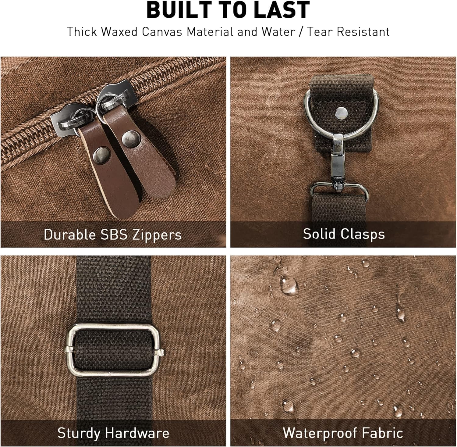 - 【Vintage Style】This duffle bag is made of waterproof durable waxed canvas, high quality leather, sturdy hardware and smooth strong SBS zippers. It is retro and stylish and can be used as a handbag. Padded handle for comfortable carrying. No need to worry about quality. This overnight bag also features a large durable adjustable shoulder strap for hands-free use.