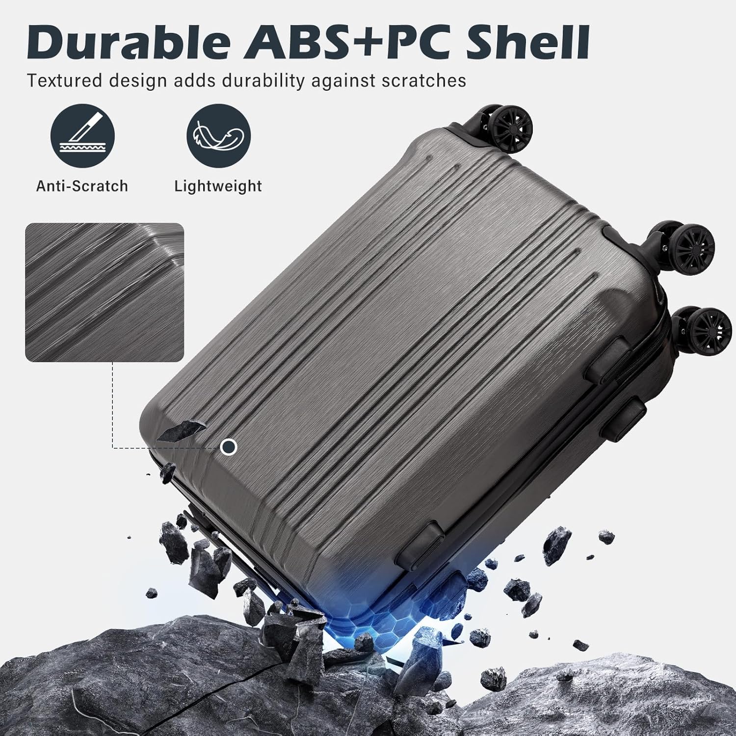 - ABS+PC material, durable and lighter hard shell, features textured finish to prevent against scratches. The beveled edge design on the upper part increases toughness for the luggage.