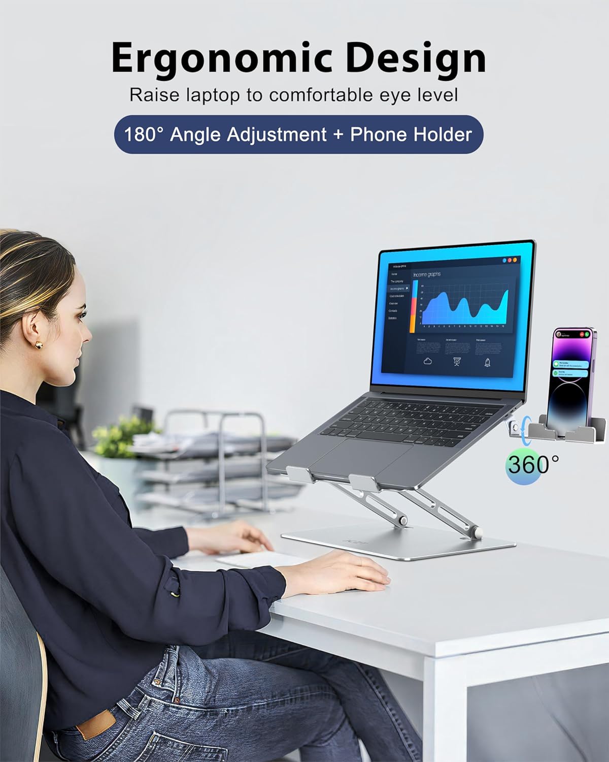 Adjustale Laptop Stand for Desk with Phone Holder, Aluminum Universal Computer Stand for Laptop, Ergonomic Computer Stands Compatible with MacBook Air, Pro, All 11-16'' Notebooks Laptops, Silver
