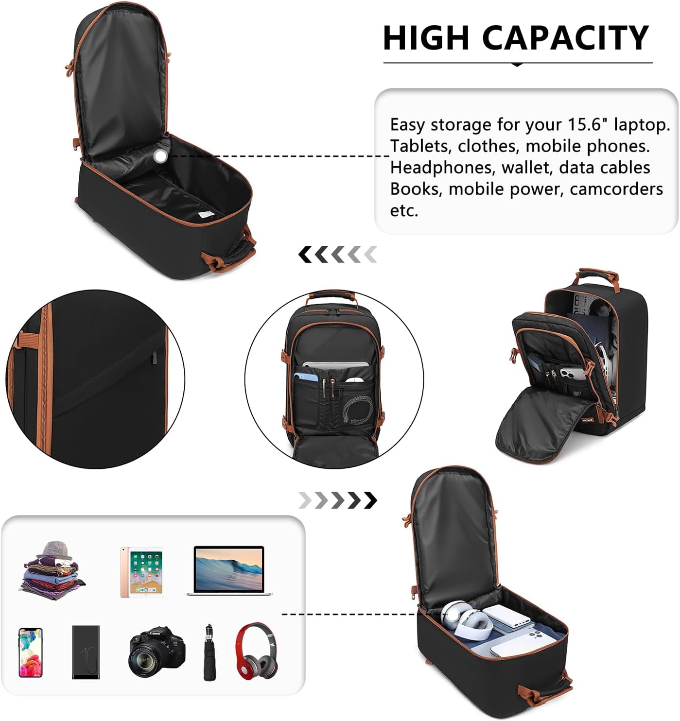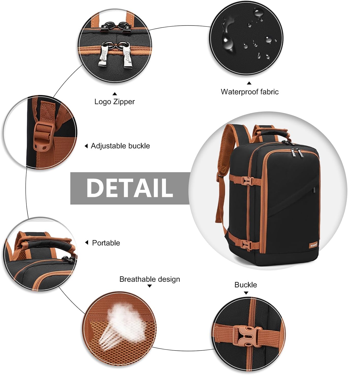 Kono Carry on Backpack, 16" Airplane Approved Under Seat Travel Backpack for Men and Women, Waterproof Lightweight Daypack for Flight 20L, Black/Brown