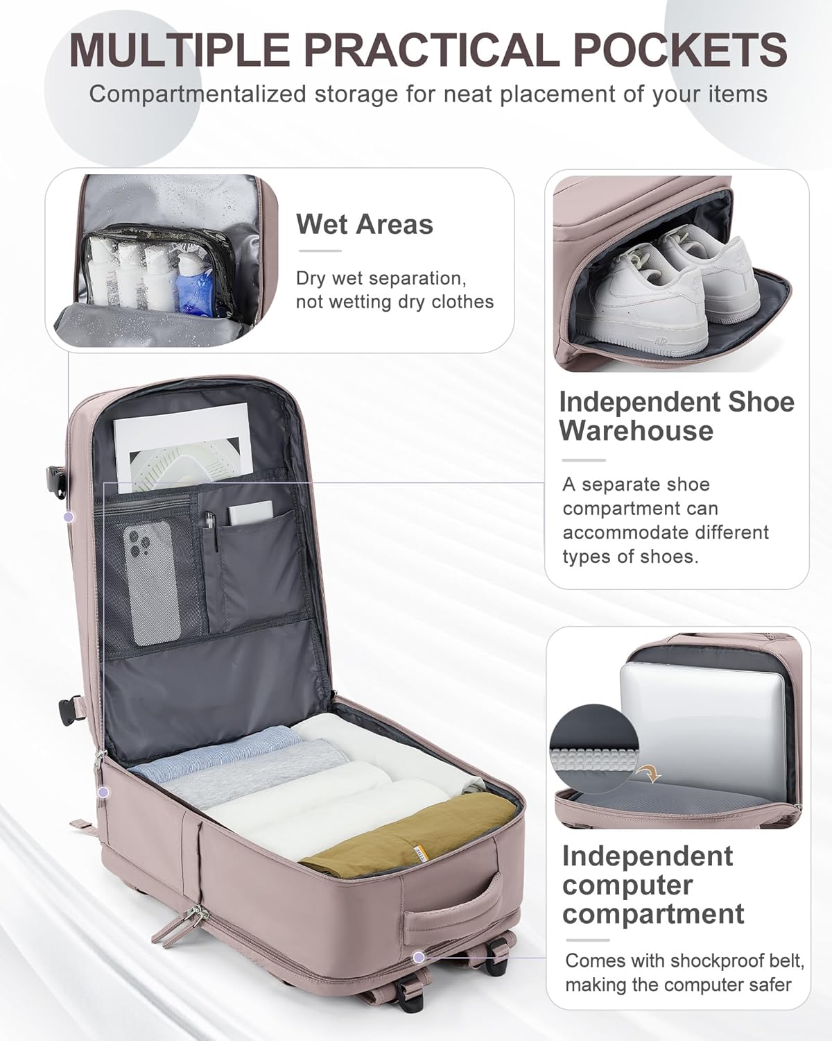 - 【Separate Shoe Compartment Design & Wet Bag】The main compartment of this luggage backpack can be opened 180 degrees, making it convenient for you to place items. Different pockets have different purposes. The wet bag is made of high density water resistant material can help you to separate dry items and wet items,if you have wet clothes or towel,you can put it in wet bag. A separate shoe compartment can help you carry and keep your shoes better in your travel bag.