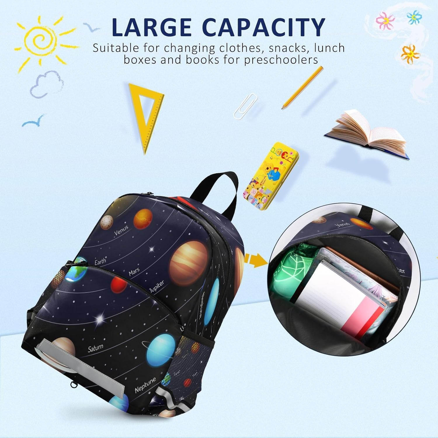 - Large Capacity: Toddler Backpack with smooth zipper closure, 1 large main bag,1 front zipper pocket, 2 side net pocket; Kid‘s backpack has a large opening bag for easy access, preschool student bag holds personal items to keep your child's belongings organized