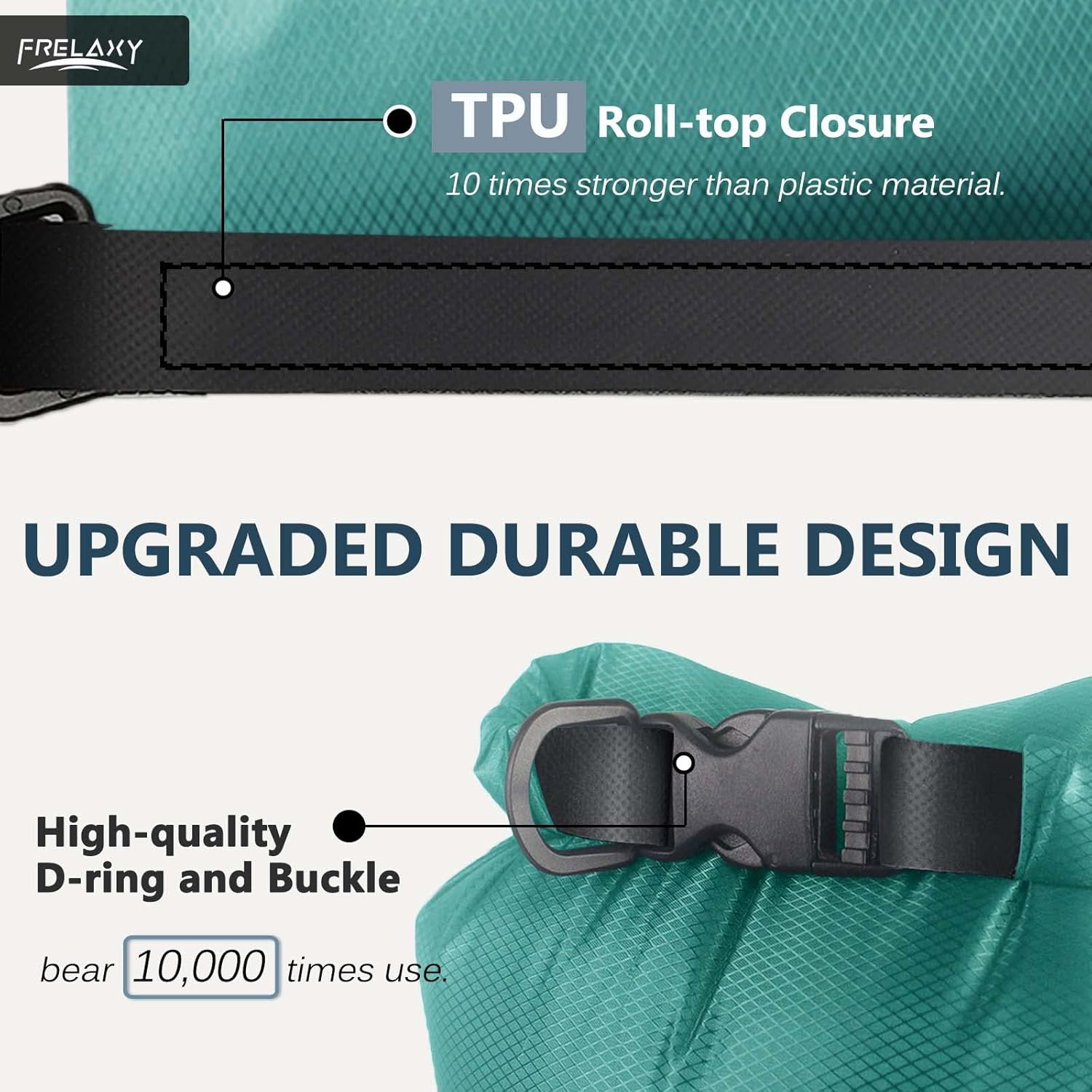 - UPGRADED DURABLE DESIGN: The dry bag is made of diamond ripstop polyester, and the roll-top closure is made of strong TPU material 10 times stronger than plastic. The sturdy D-ring and buckle can withstand up to 10,000 uses and are easy to attach to your backpack.