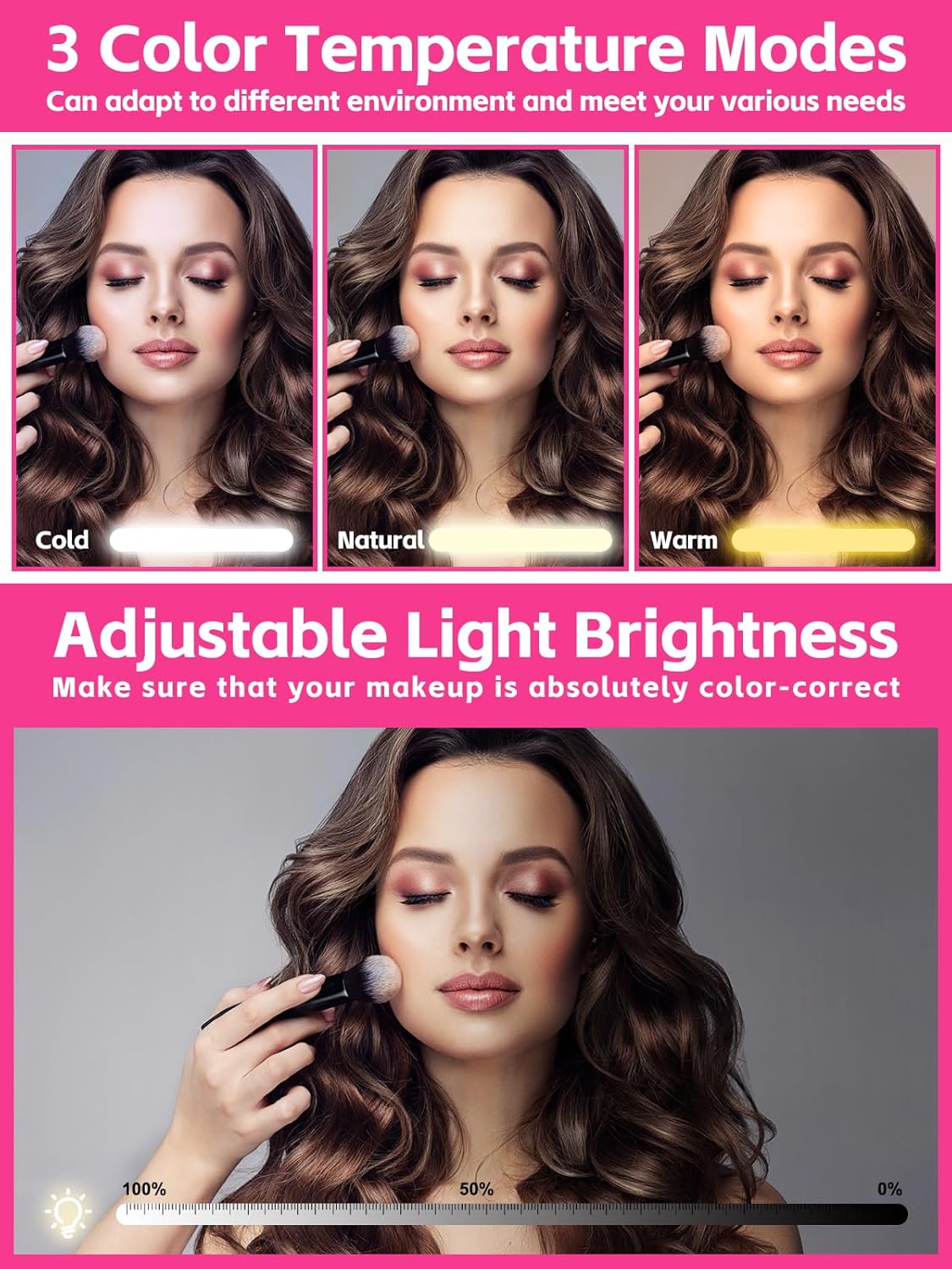 - đă4K Mirror with 3 Color LightsăKalolary cosmetic case features with a 4k full-screen light mirror, which has 3 adjustable color light, gently touch the switch can easily adjust the color temperature between cold light, natural light and warm light, long press can adjust light brightness from 10% to 100%, giving you color-corrected, flawless makeup application every time. And the mirror angle is also adjustable allows multiple angle for your convenience.