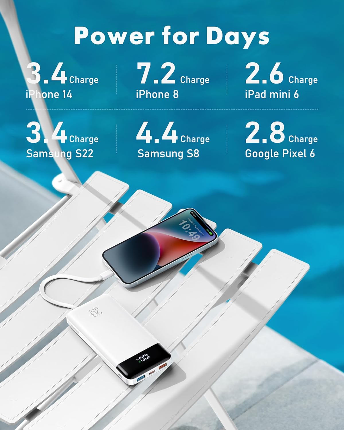 - đăStay Powered AnywhereăThis 20K portable charger delivers 3-4 full phone charges - perfect for camping, flights, or emergencies. Fits easily in backpacks to keep devices alive through weekend trips, festivals, or work travel.