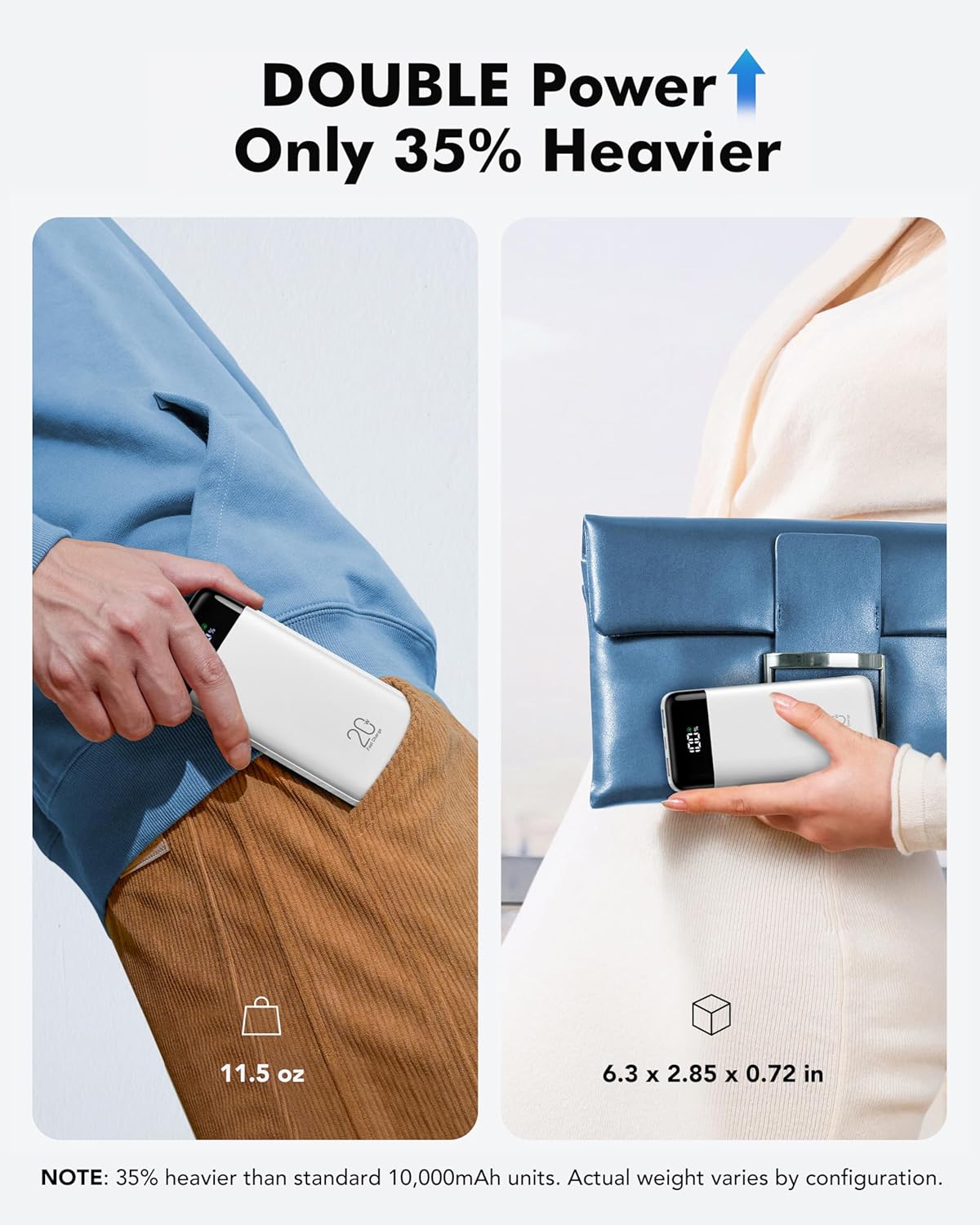 - đăDouble the Power, Only 35% HeavierăBattery pack 20,000mAh (2X capacity of standard chargers) in just 6.3 x 2.85 x 0.72 in - only 35% heavier than 10K models but holds twice the energy. Fits anywhere a paperback book would.