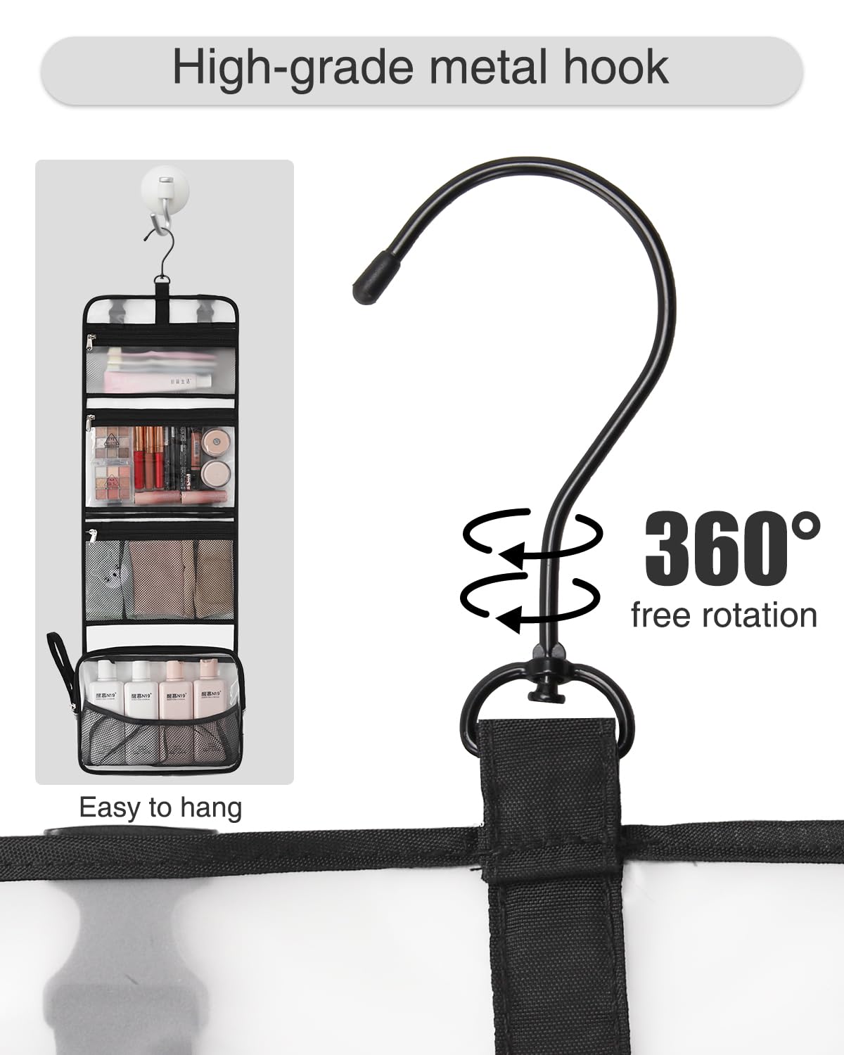 - 【CONVENIENT DESIGN】Stow-away 360 degree swivel non-slip metal hook for versatile hanging options. It fits bottles upright, helps eliminate spills, and makes a great travel organizer for your travel toiletries.