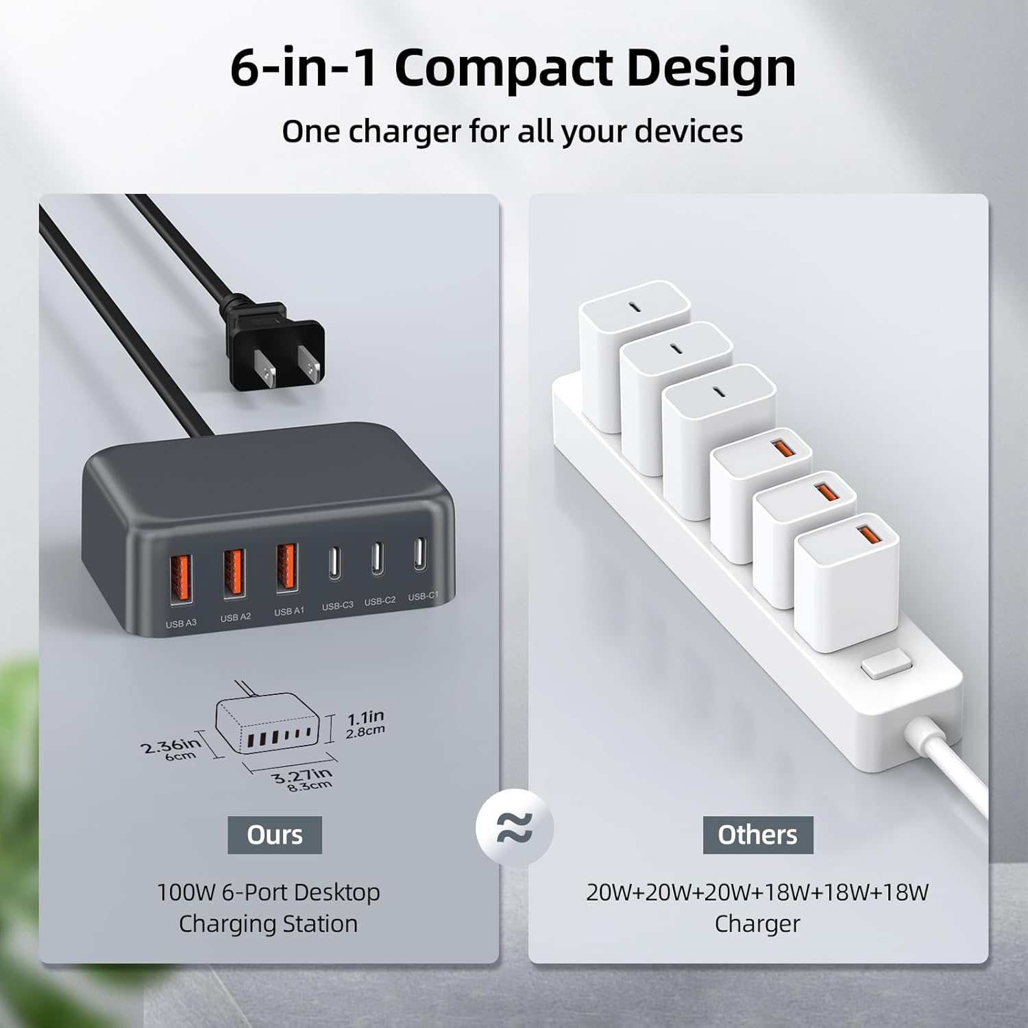 - ⚡【Super Fast Charging】USB C Charger Block with 3 USB-C Power Delivery port(each port 20W max) and 3 QC USB-A port(each port 18W max), total output power up to 100W. Equipped with a 5 ft extension cord, it is not restricted by distance and can be charged without restraint. 6 in 1 USB-C Charging Station can provide high-speed charging for iPhone, Samsung, ipad, watch, fan, portable charger and other 6 devices at the same time. Charge your iPhone 14 from 0% to 50% in just 30 minutes