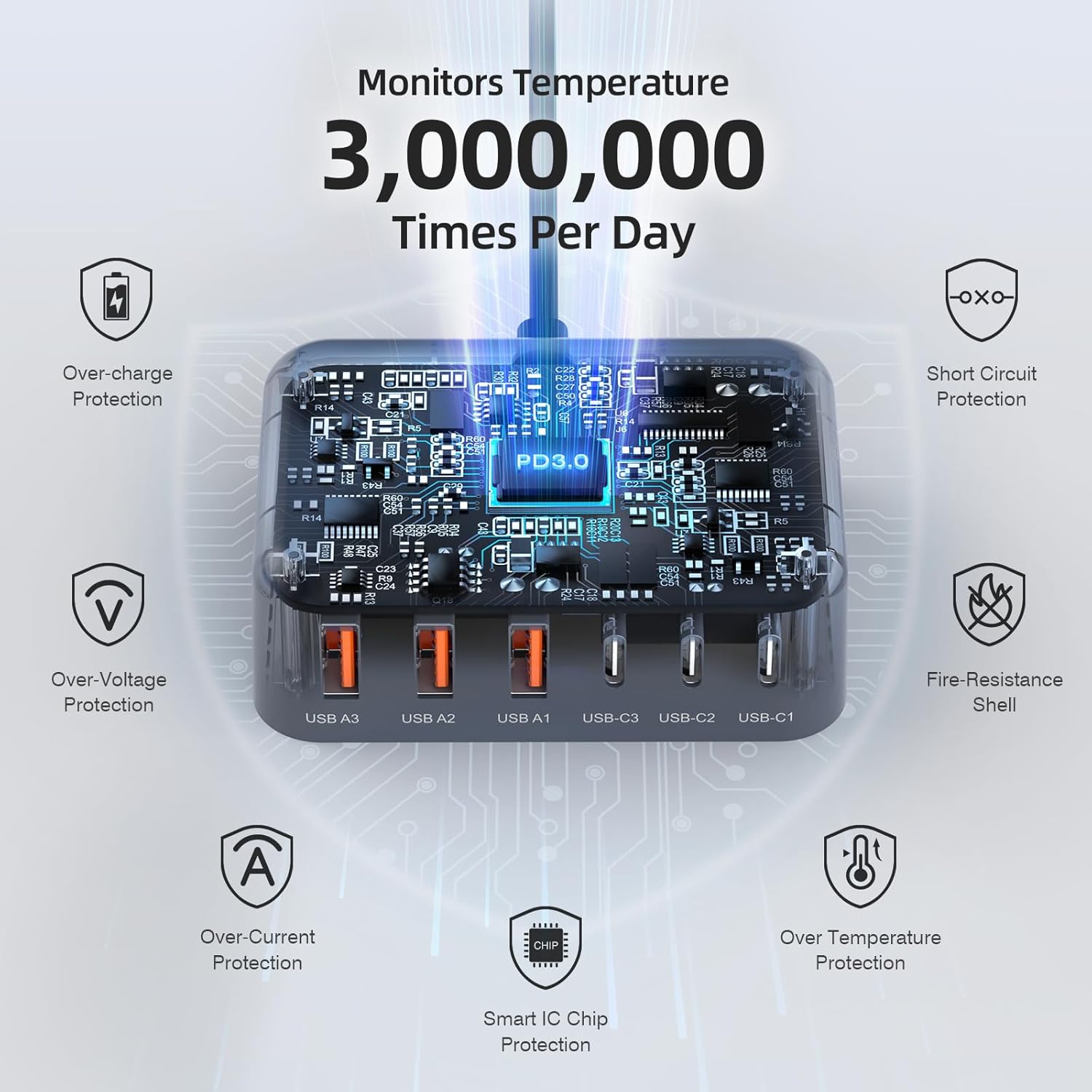 - ⚡【Safety & Reliability】Built with premium Navitas Gallium Nitride (GaN) chipsets operate more efficiently and generate less heat.The multiport USB C desktop charging station boasts over-current, over-voltage, short-circuit, and overheating protection, maximizing the charging safety. USB C wall charger passed UL CE FCC RoHS safety certification ensures 100% complete protection for you and your devices