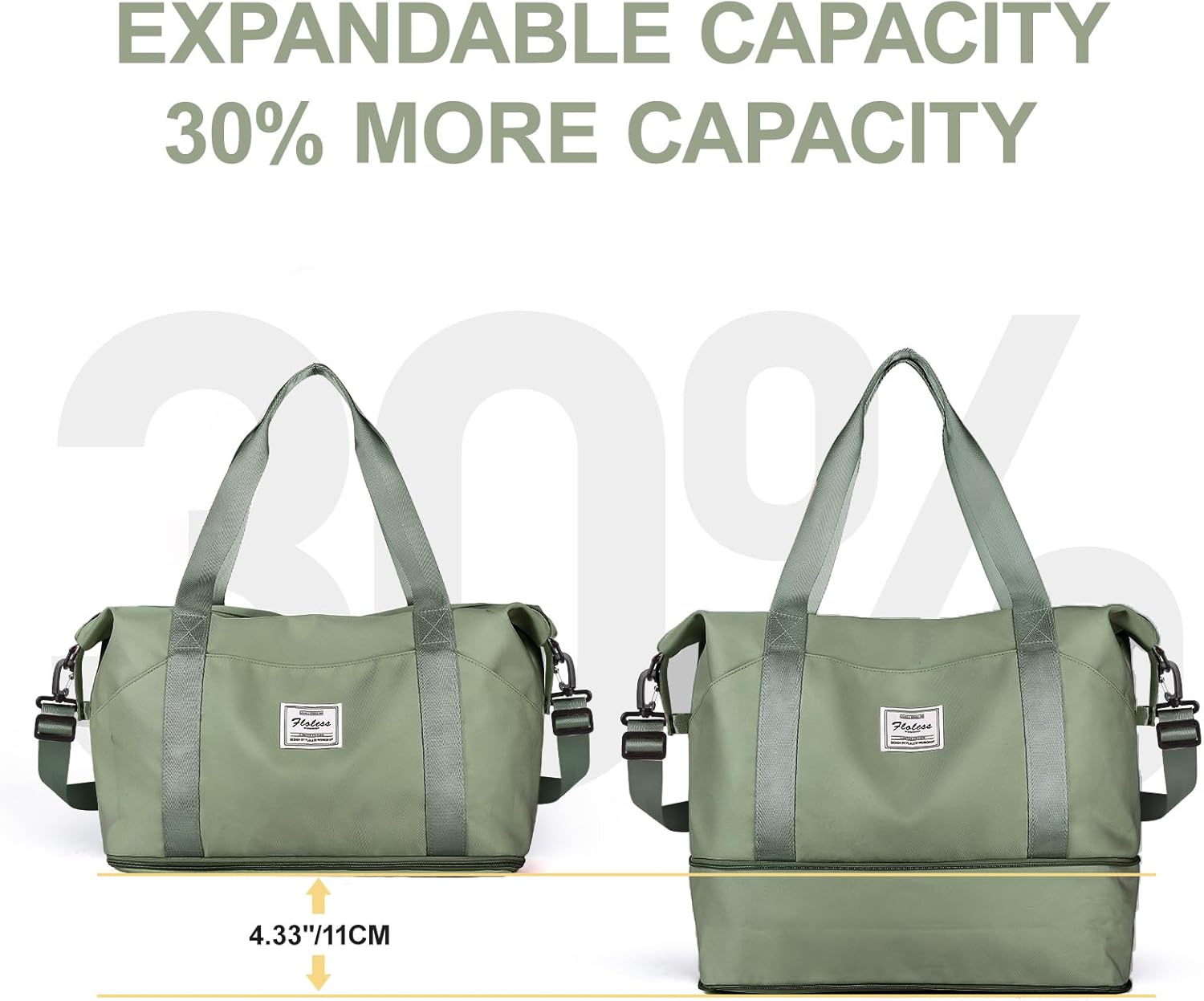 - 【High Capacity Travel Bag】Travel Bag has three multiple internal and four external organizational pockets,which ensure you placed more scientifically and orderly.The overnight bag for women has Large Capacity.Ordinary size :41*26*22CM,Expansion Dimension:41*37*22CM.You can carry it onto an airplane. Large storage space for a clothes for short trip.It has a capacity of 35L and can hold 6 to 8 pieces of summer clothes,Cosmetics,toiletries,wallets,keys,earphones,mobile power,mobile phones,files.