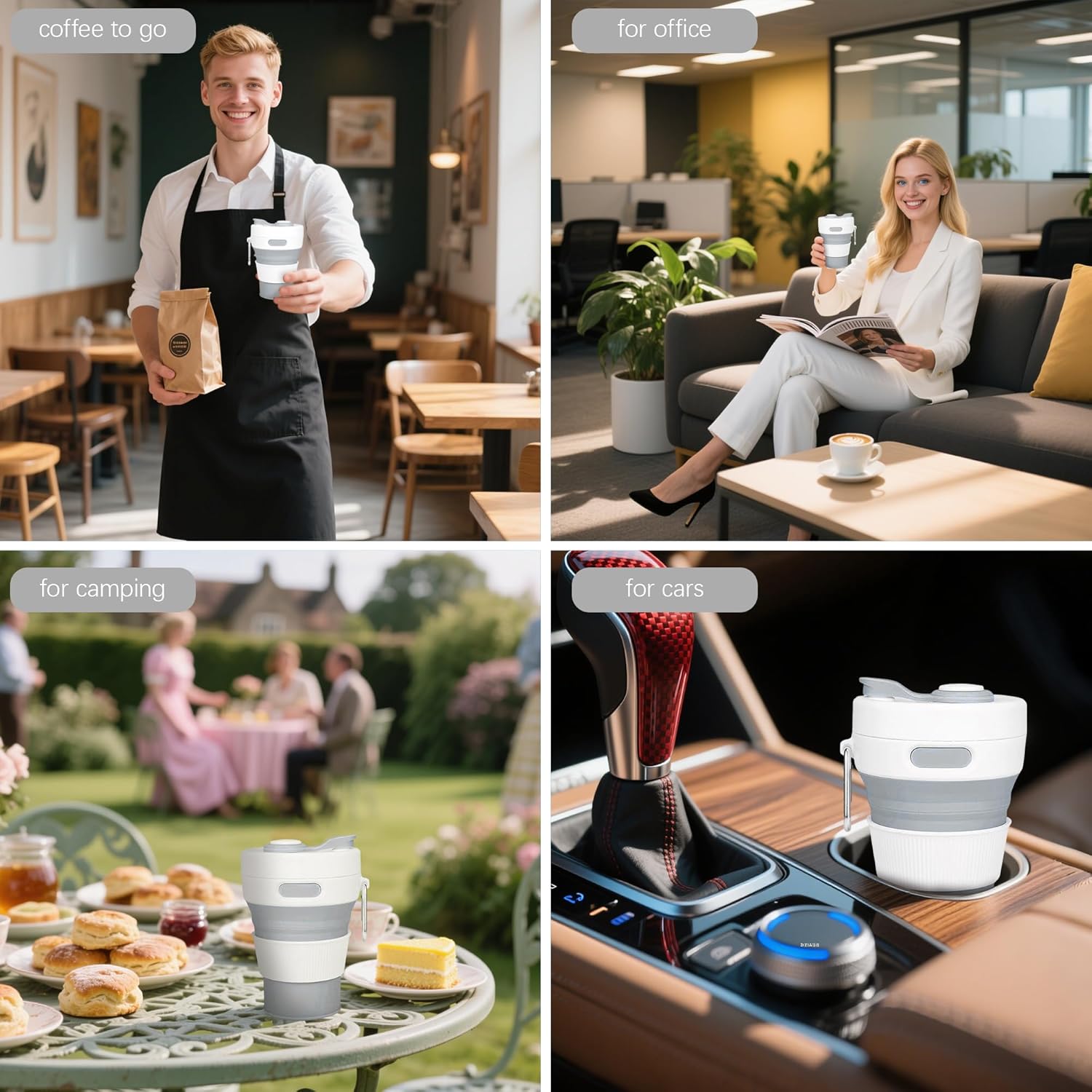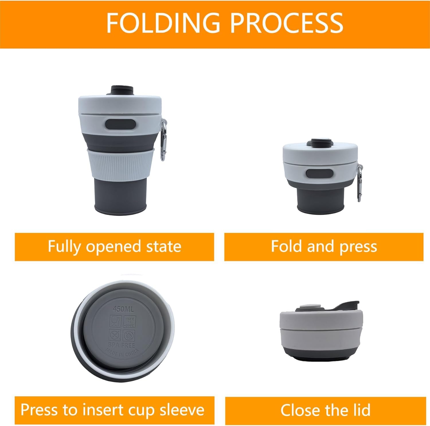- COLLAPSIBLE HIGH QUALITY TRAVEL COFFEE MUG: Bringing your own reusable mug has never been easier (or fun)! This compact mug holds 15 ounces and folds down to just 2.4 inches. The mug is perfect for drinks and picnics at home or on the go! When you're done using it, simply remove the insulated sleeve and fold it up. Leak-proof, airtight, non-slip and fits in car seats, pockets, purses and backpacks.