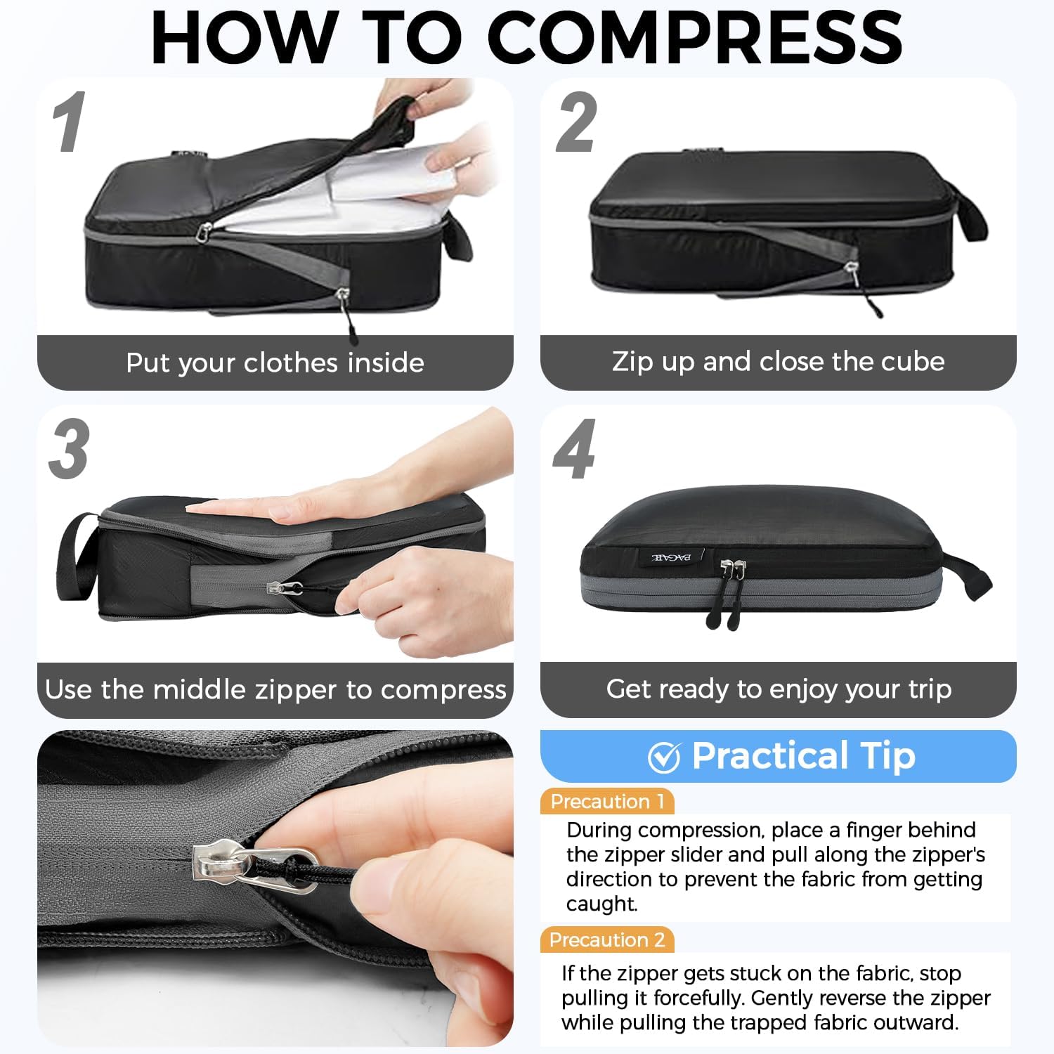 - How to Compress:The cube is compressed by the middle zipper; Using steps: 1)Fold and flatten clothes 2)Pack clothes in the cube and zip the front zipper 3) Put a finger on the back of the middle zipper when compressing to avoid zipper get stuck in fabric