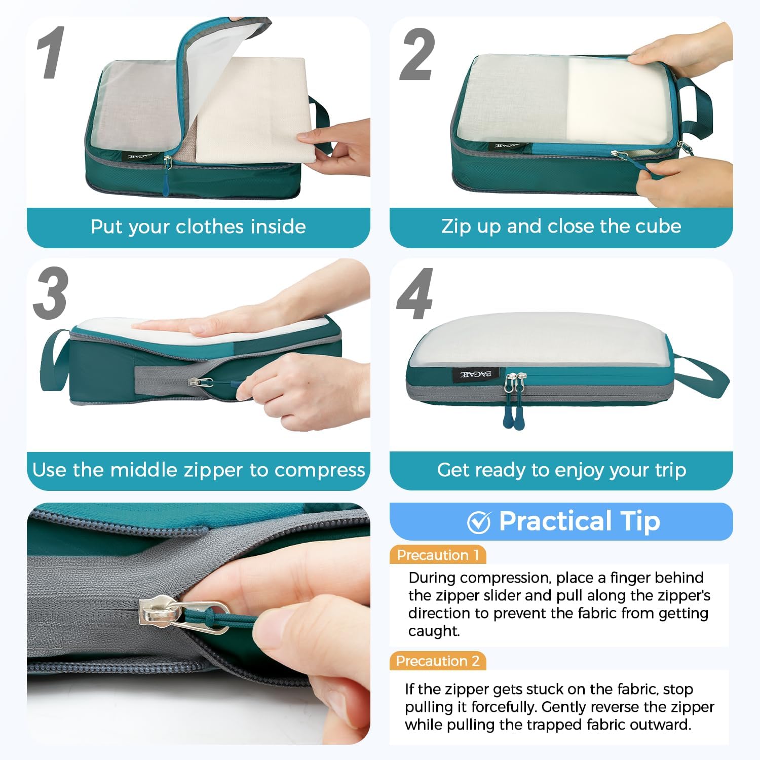 - How to Compress:The cube is compressed by the middle zipper; Using steps: 1)Fold and flatten clothes 2)Pack clothes in the cube and zip the front zipper 3) Put a finger on the back of the middle zipper when compressing to avoid zipper get stuck in fabric