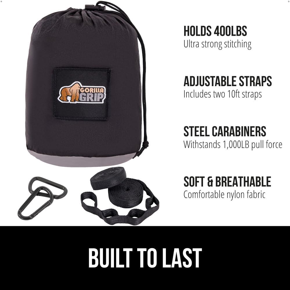 GORILLA GRIP Durable Portable Camping Hammock, Holds 400lbs with Heavy Duty Tree Straps, Comfortable Travel Swing, Camp Hammocks, Easy to Use and Install, Outdoor Essentials, Black, 9x4.5 FT