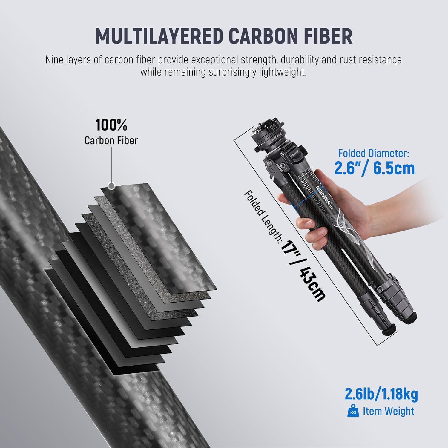 - 【100% Carbon Fiber Compact Travel Tripod】 The LT32 (formerly TP62) from NEEWER LITETRIP Series portable tripods, is a 2.6lb/1.18kg lightweight carbon fiber tripod for phone and camera with a 1"/26mm tube for stability and a 22lb/10kg load capacity (10lb/4.5kg with ball head). When folded, it's just 17"x2.6"/43x6.5cm, fitting easily in the carry bag. It also has a hook for counterweights on the center axis, ideal for outdoor shooting like landscape, nature, wildlife, and architecture photography