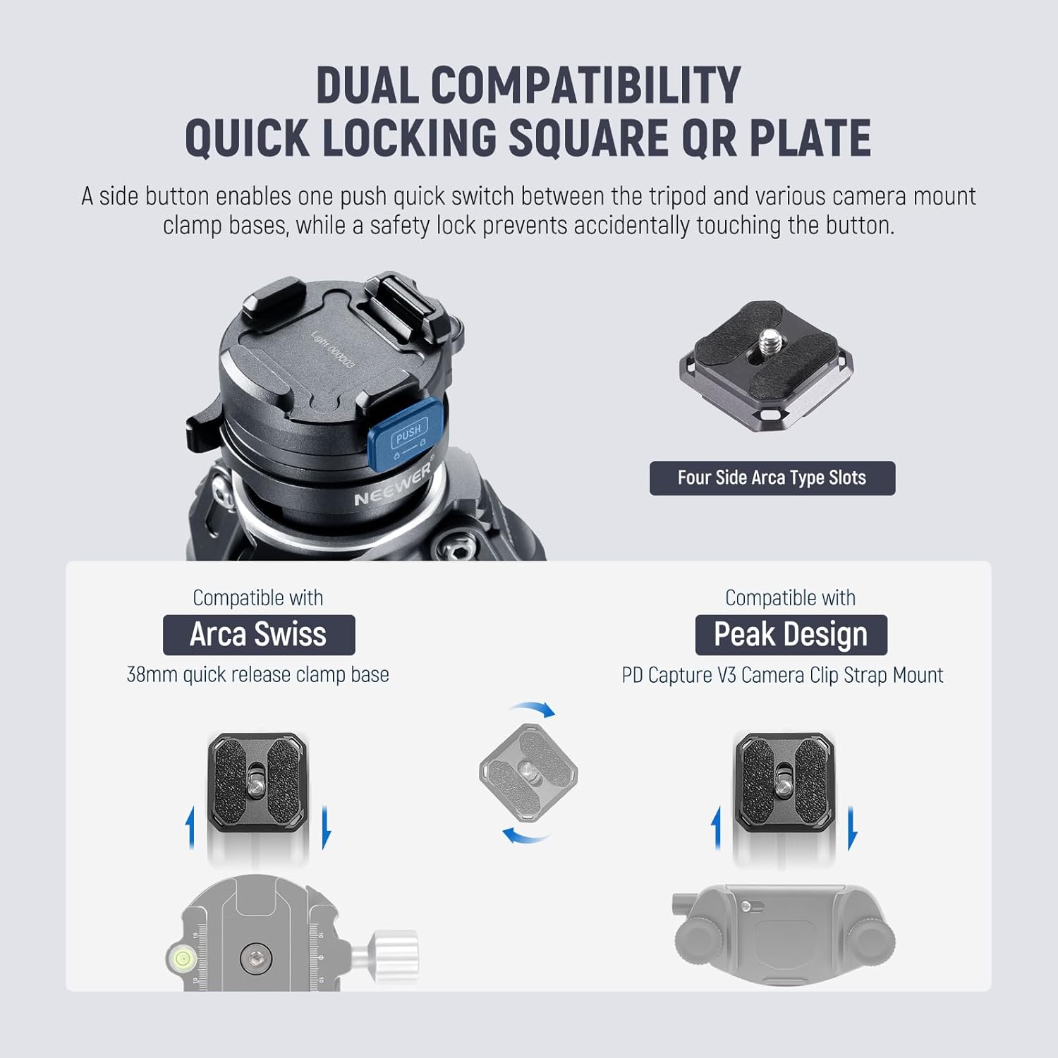 - 【Quick Lock Arca Type Square QR Plate】 The Arca type quick release plate is also compatible with the Peak Design PD Capture clip V3. A side button enables one push quick switch between the tripod and various camera mount clamp bases, while a safety lock prevents accidental contact with the button.Note: QR clamp compatible only with PD QR plates and included Arca type plates