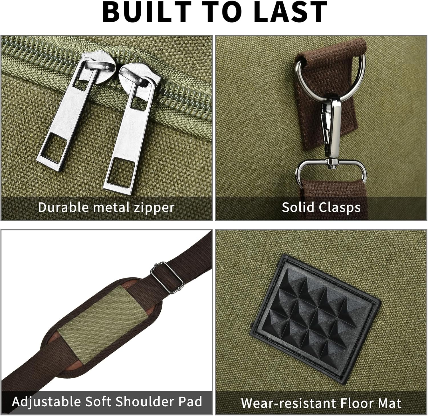 - Durable & Heavy-Duty – Built to Last.Crafted from premium 16oz canvas, this large duffle bag for men offers exceptional durability and reliability. Reinforced with sturdy metal hardware, it can withstand weights of up to 35kg, making it the perfect choice for rugged travel. Whether for daily use or weekend trips, this overnight bags for men is designed to handle it all.