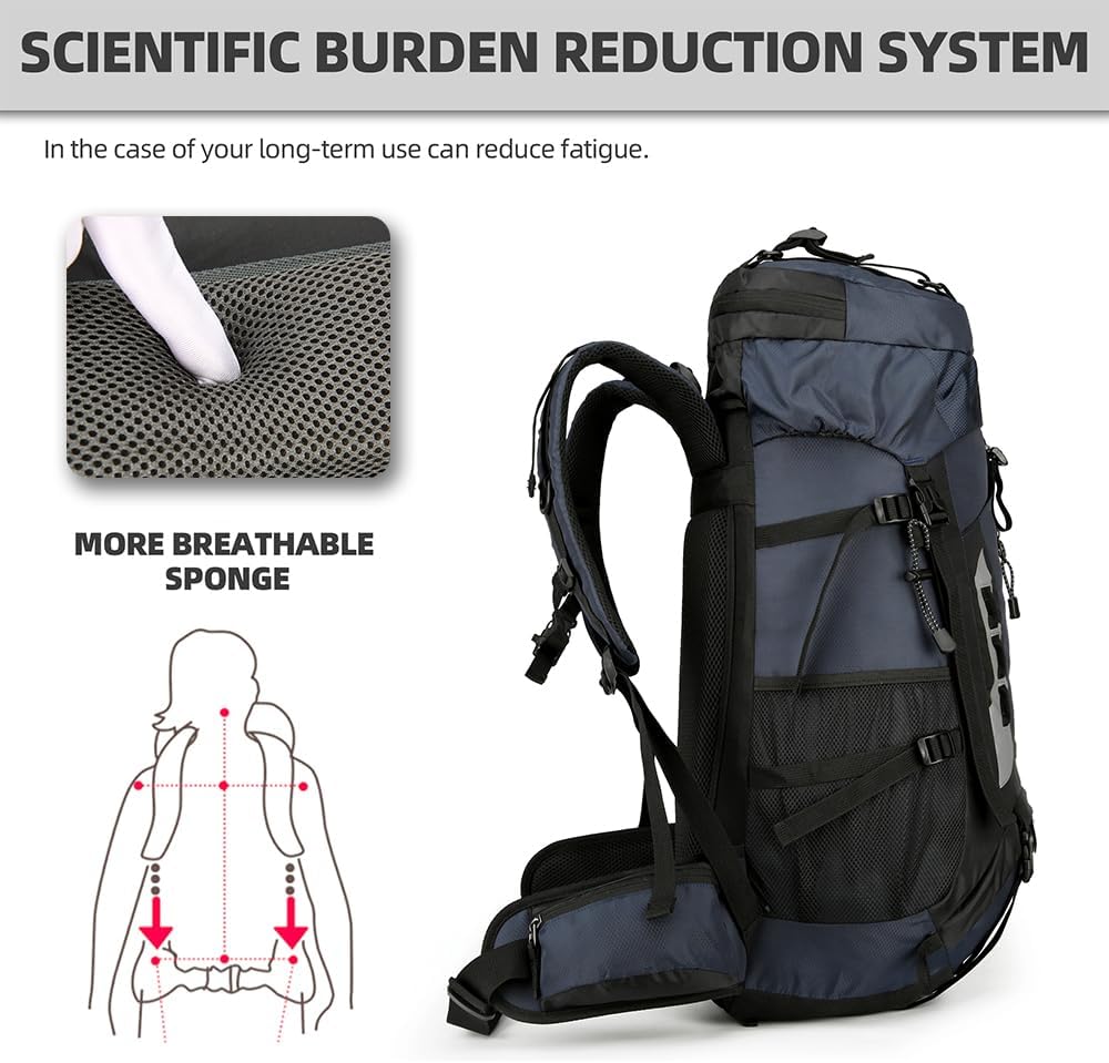 King'sGuard 60L Hiking Backpack Large Waterproof Camping Backpack for Men and Women Lightweight Frameless Backpacking Backpack with Rain Cover (Navy Blue)