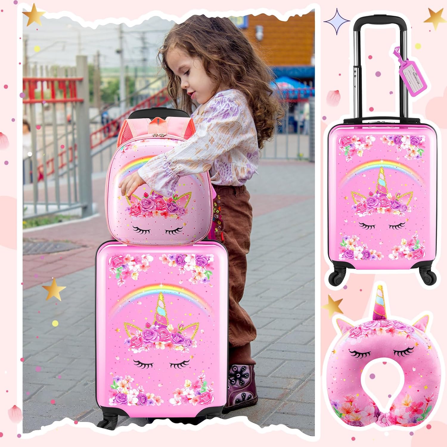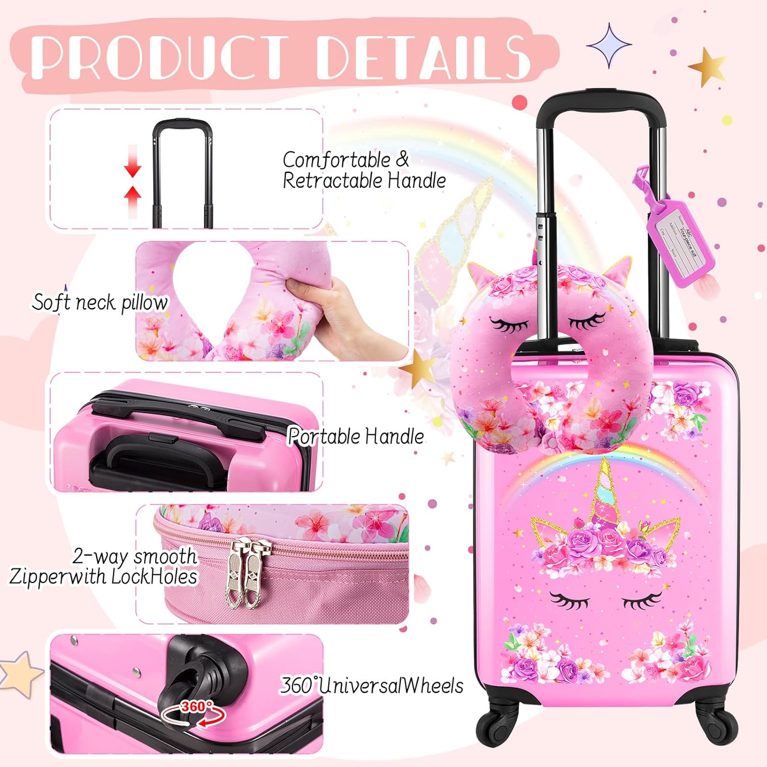 - Lots of space: Our Unicorn Kids Suitcase set includes a 17-inch carry-on suitcase with unicorn pillows, name tags and a kids' Unicorn backpack, all with plenty of compartments and large capacity for easy packing; The rolling backpack is about 17 inches high and the backpack is about 11 inches long; But please be careful not to overpack, we use strong zippers to protect our items, please trust our quality