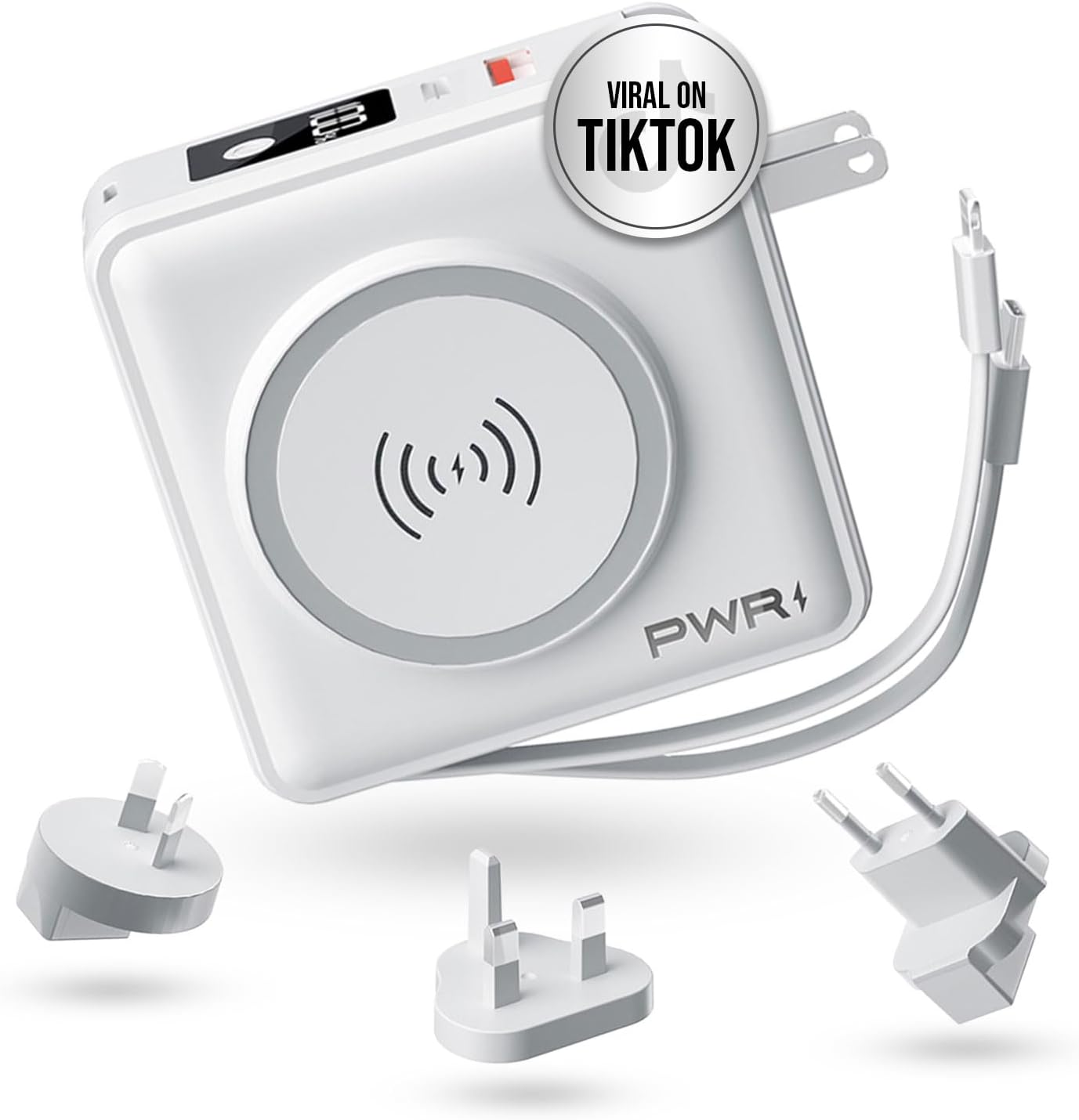 PWR Travel PRO 5-in-1 Power Bank – 10,000mAh with Built-in Cables – 20W USB-C + 15W Wireless Charging – Compact Portable Charger for iPhone & Android - White