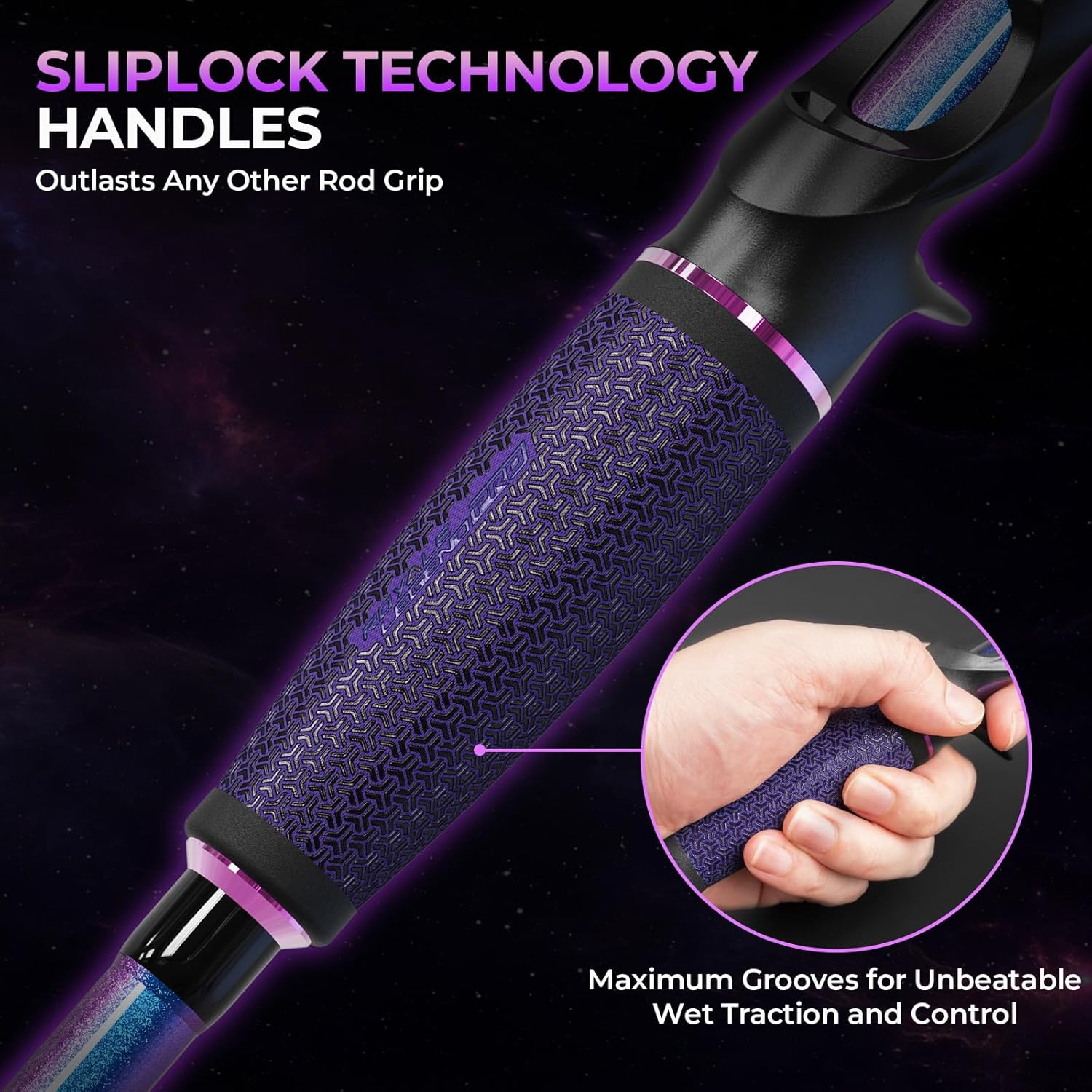 - SlipLock Technology Handles: Experience unparalleled grip and control with the SlipLock Technology handles featured on the Royale Legend Pro fishing rod. Engineered with a unique silicone texture boasting maximum grooves, these handles provide unbeatable wet traction, ensuring a secure grip even in slippery conditions. Outlast any other rod grip.