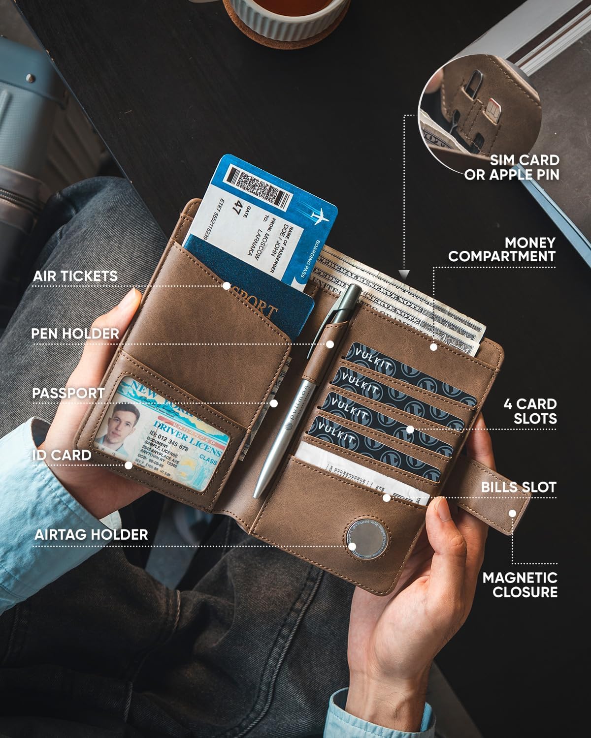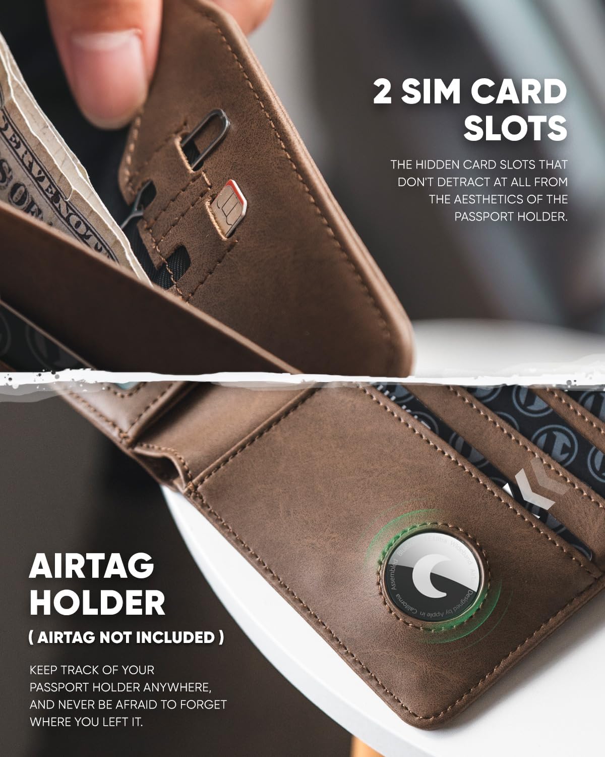 - Travel Passport Organizer- Includes a passport compartment, 2 SIM card slots, 4 credit card slots, a bills slot, an Airtag holder, an ID window, an air tickets compartment, a cash compartment, and a pen holder. Multi-purpose will be convenient for travellers or business men.