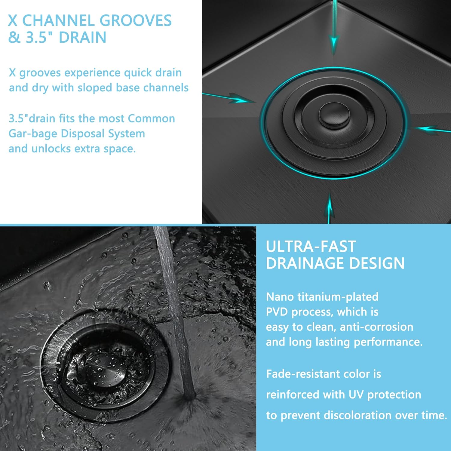 - [Fast & Complete Drainage Design]: This 15 inch black bar sink is designed with slopped bottom and X-shaped drain grooves that ensure draining water quickly and prevent water pooling. Standard 3.5" drain openings will fit any garbage disposal unit. WARM TIPS: After use, keep the surface of the sink dry can extend its service life.