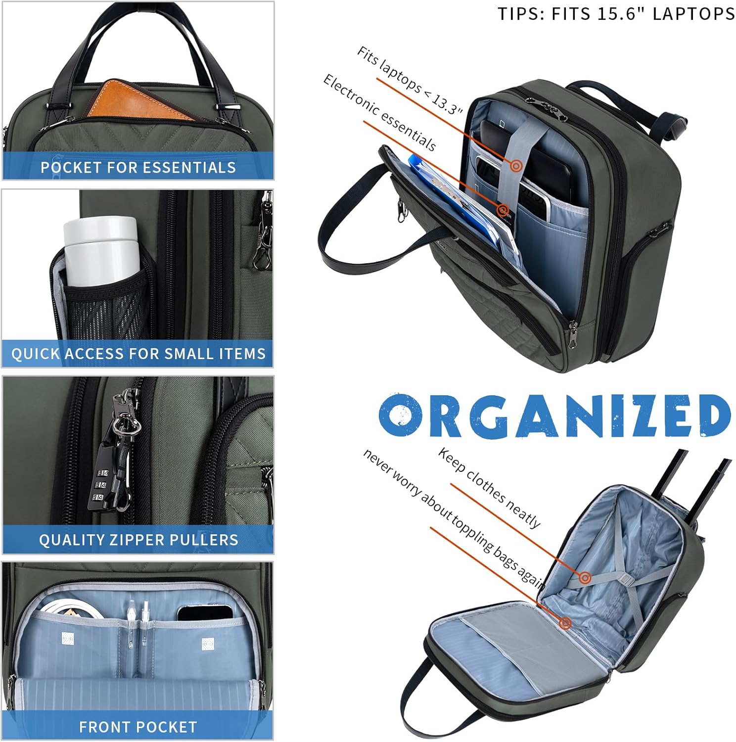 - MULTI- FUNCTION PERSONAL BAG: Spacious main compartment works well for clothes/shoes. Features a padded laptop compartment that fits laptops up to 15.6 inches. Easy-access front organizer for small items. Both sides with zipper pockets for the battery and water bottle.