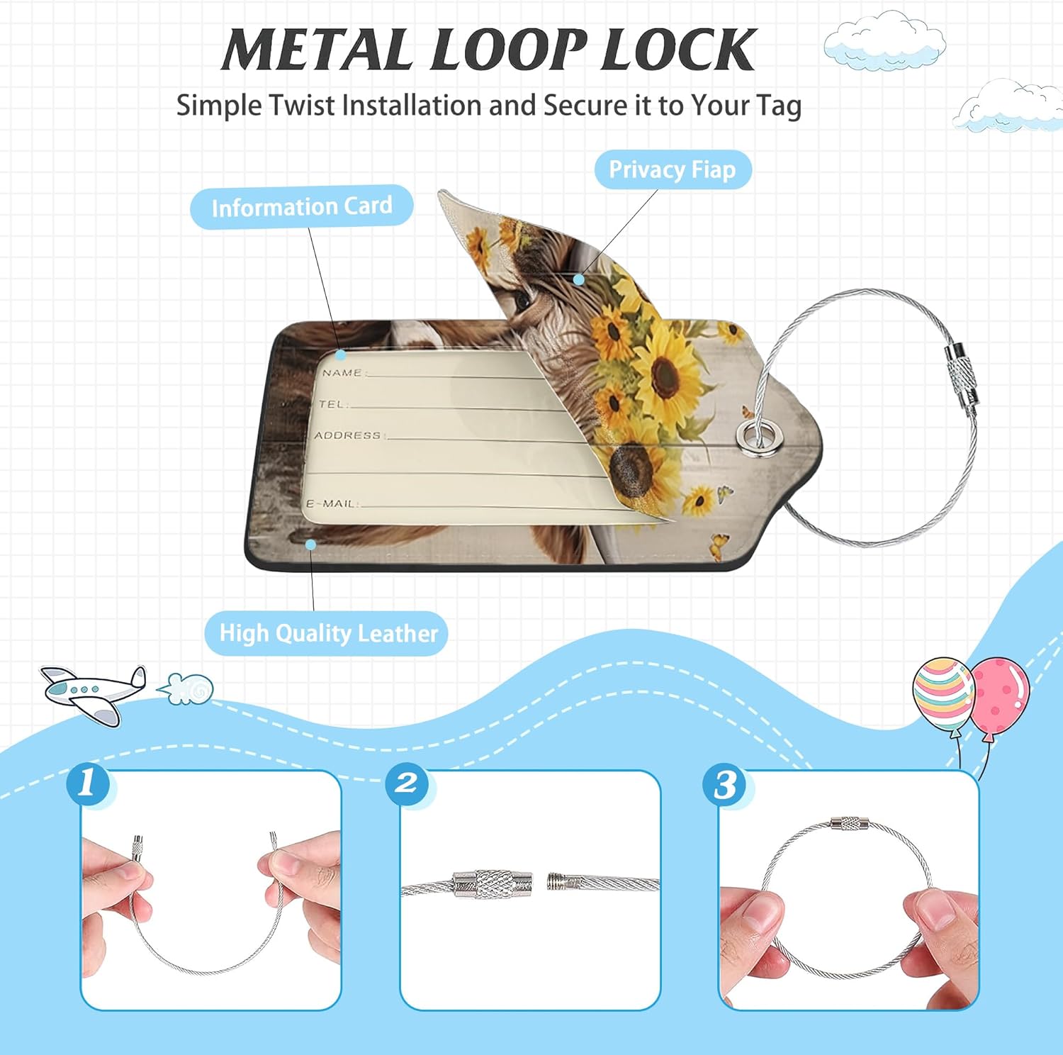 3 Pack Luggage Tag for Suitcase,Highland Cow Leather Luggage Tags with Privacy Cover Name ID Label Identifiers Travel Bag Tags for Women Men Boys Girls