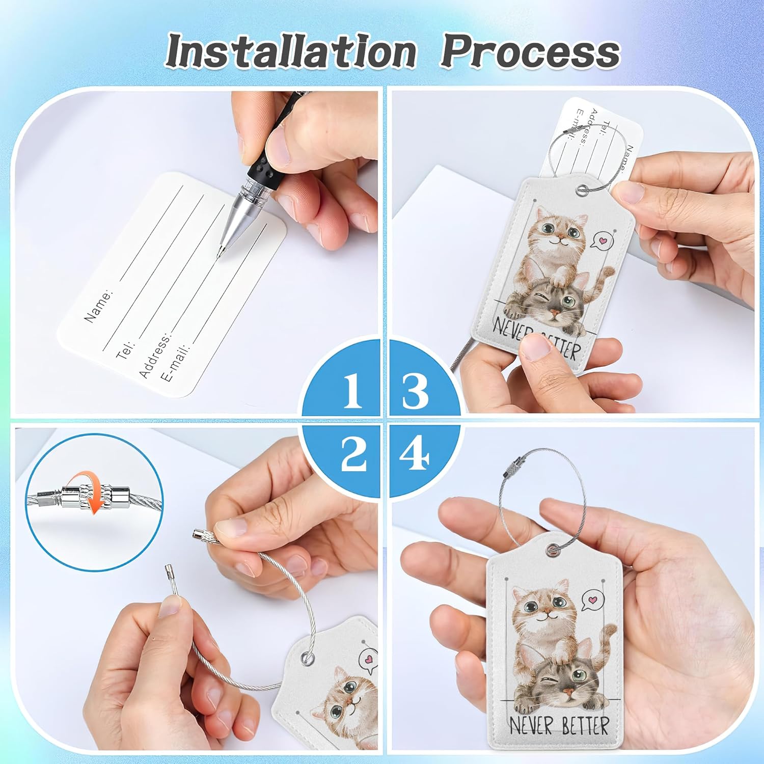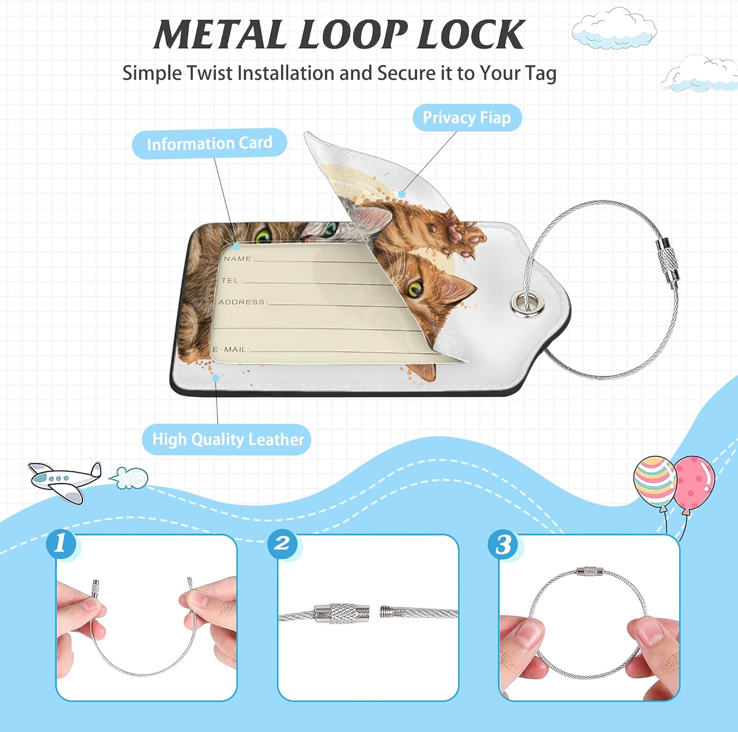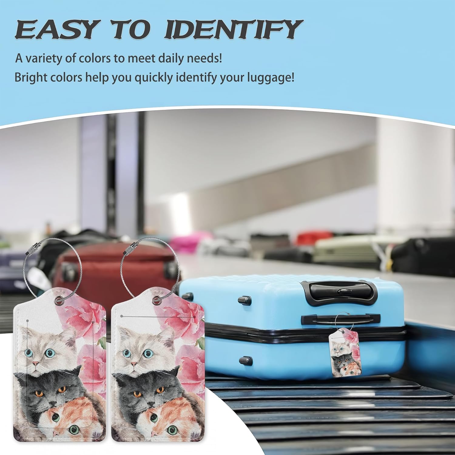 3 Pack Luggage Tag for Suitcase,Cute Funny Cat Leather Luggage Tags with Privacy Cover Name ID Label Identifiers Travel Bag Tags for Women Men Boys Girls
