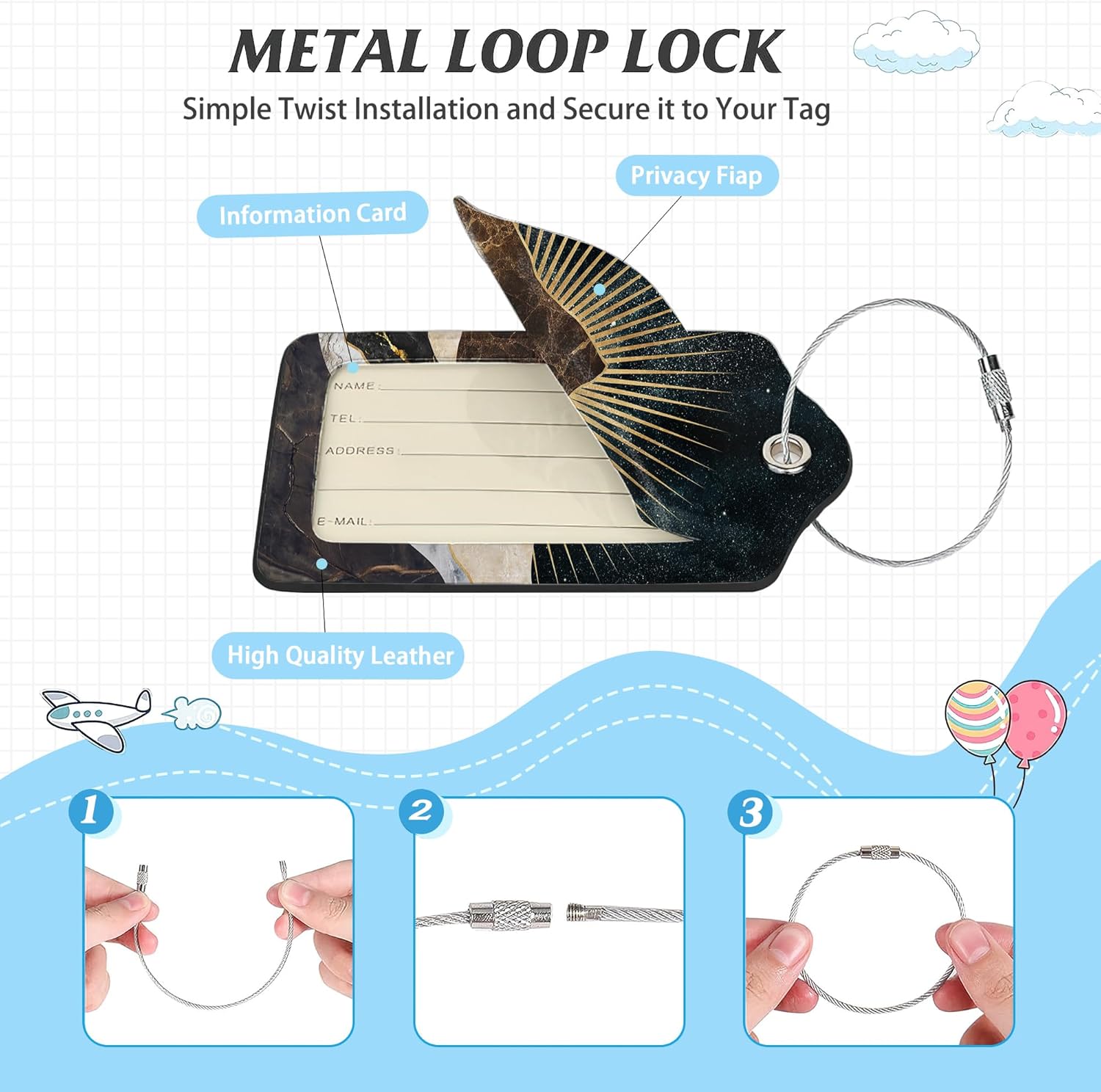 - 【Protect Your Information】: Each luggage tag comes with a privacy cover, ensuring that your personal details are not easily visible to others. The tag also includes a small information sheet where you can fill out your contact information, allowing for easy identification and assistance in the event of lost luggage.