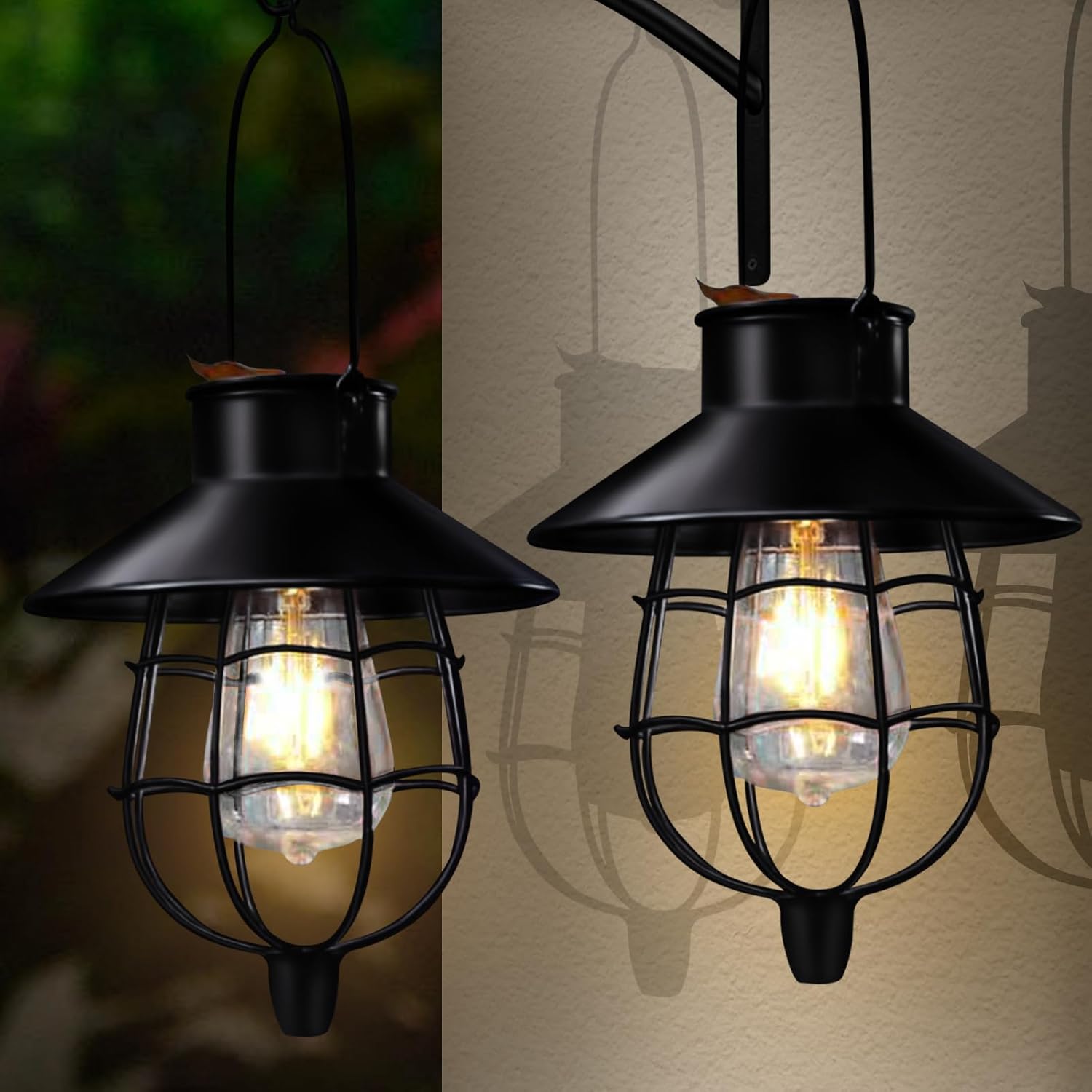2 Pack Solar Lanterns Outdoor Waterproof Hanging Solar Lights with Vintage Metal Warm White Light Edison Bulb Design, Decorate for Garden Yard Porch and Christmas(Black)