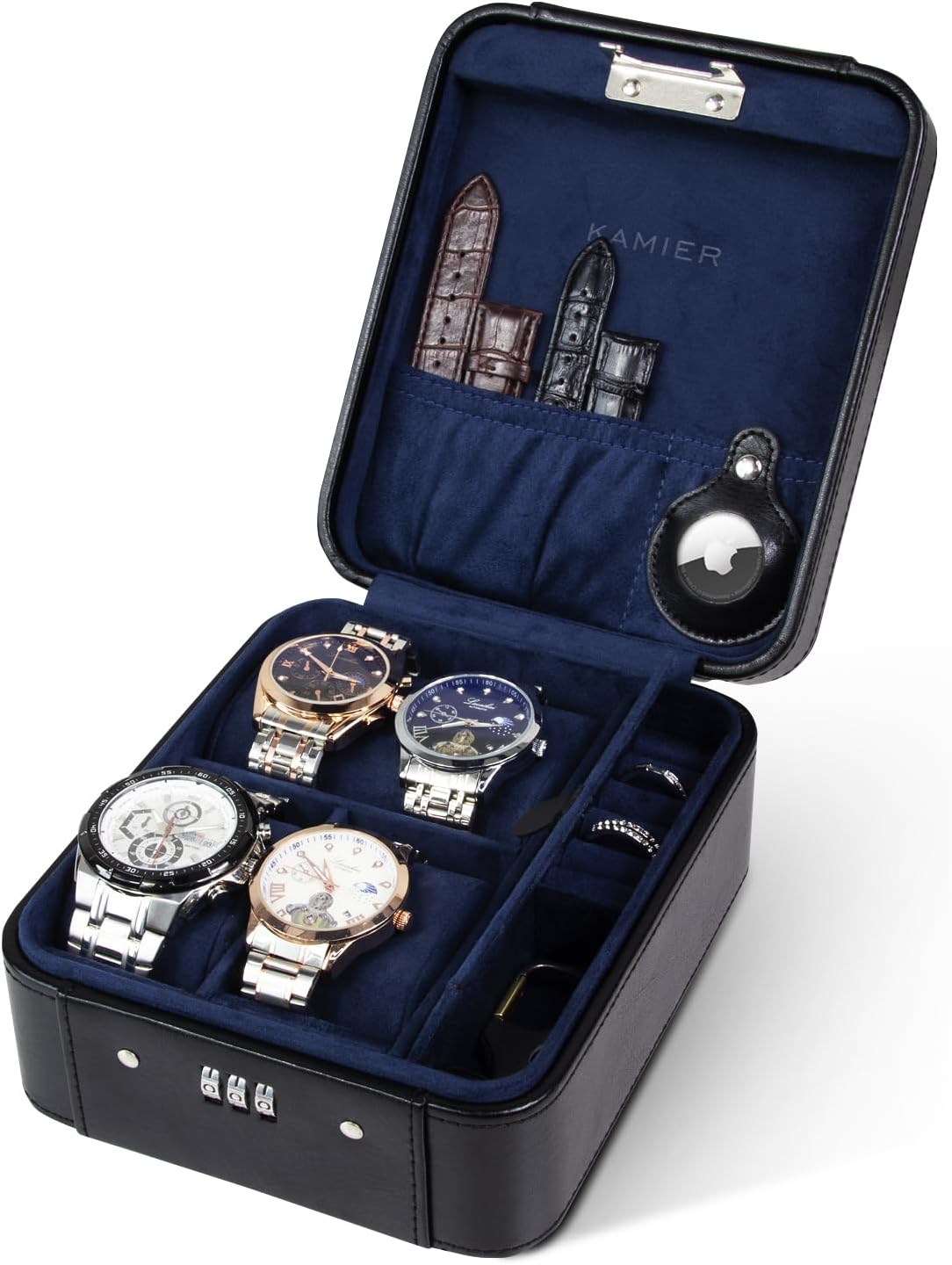 KAMIER Watch Case with Combination Lock - 4 Watch Storage and Jewelry Organizer - Watch Travel Case for Ring and Watch Storage, PU Leather Travel Watch Case, Ideal for Gift (With Gift Box),Black