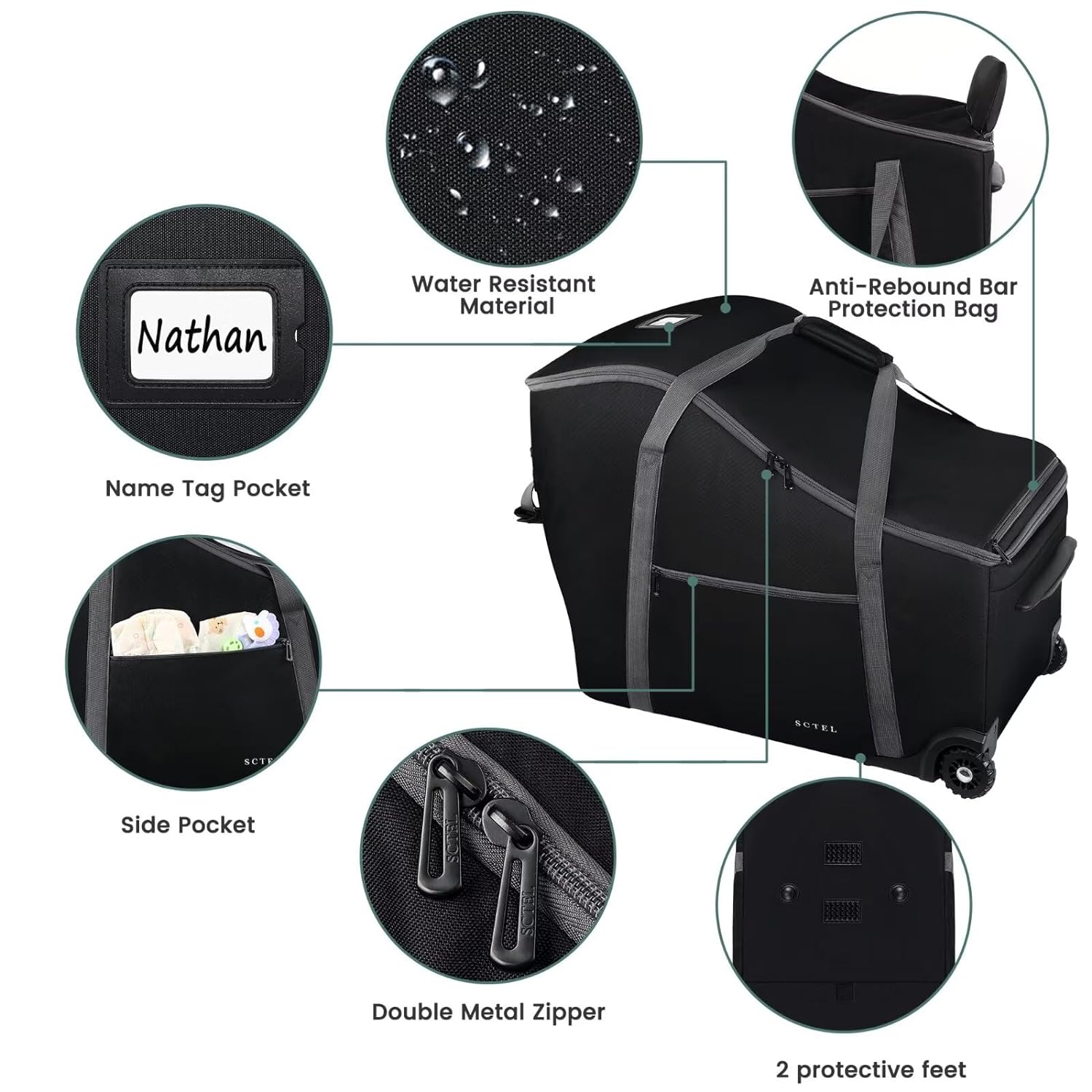 - 【Silent Wheels】Traveling with your baby can be challenging, but with this car seat airplane bag, you can make the experience less stressful. The bag's design, with its two high-quality silent wheels and padded handle, makes travel easy and reduces stress. Plus, it's versatile enough for hand-carry and can be conveniently folded to fit into a backpack, stroller basket, or carry-on bag. SCTEL car seat bag is a reliable baby travel accessory to make travel easier and hassle-free.