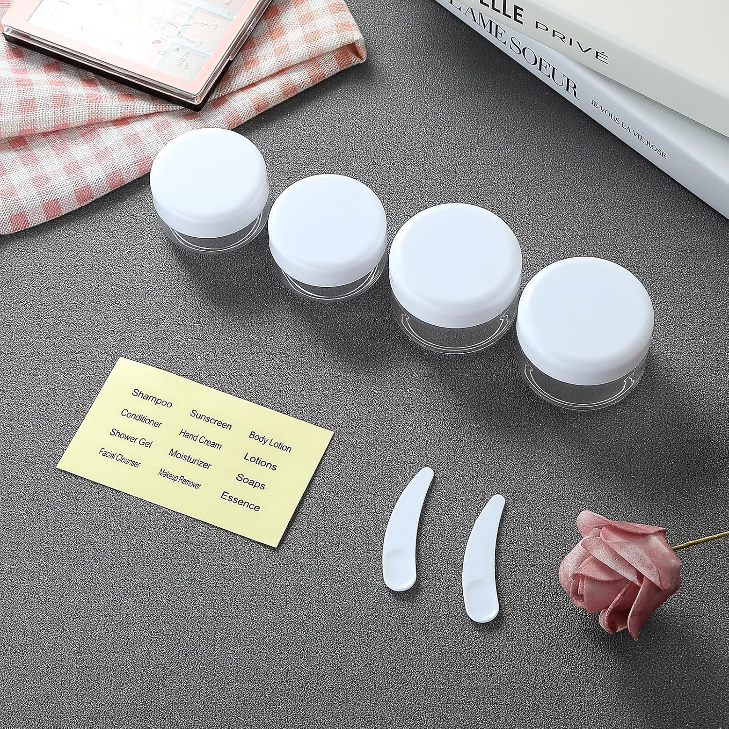 - Useful Travel Accessories: This is a nice assortment of travel containers in a useful zip case. ( Come in 4 Travel Bottles+4 Travel Jars+2 Spray Bottles+2 Scoopers+1 Funnel+1 Clean Brush + 1 Page Label + 1 Clear Toiletry Bag ) Multiple ones allow you take along different beauty products and toiletries according to your requirement