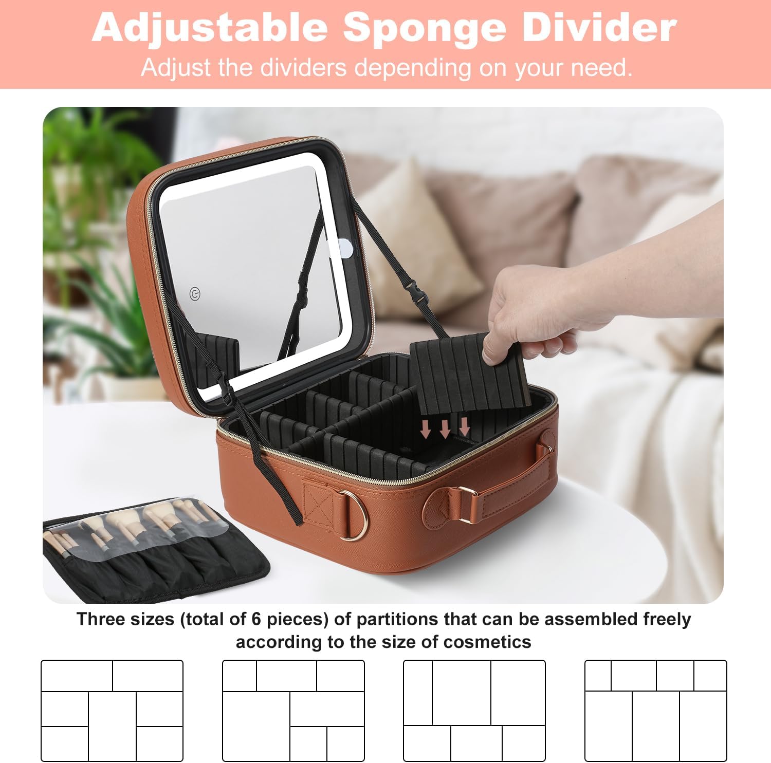 Mocado Travel Makeup Bag with LED Lighted Mirror, Travel Makeup Organizer, Makeup Case with 3 Color Lighted Setting and 10x Magnifying Mirror, Portable Storage and Adjustable Dividers(Orange Brown)