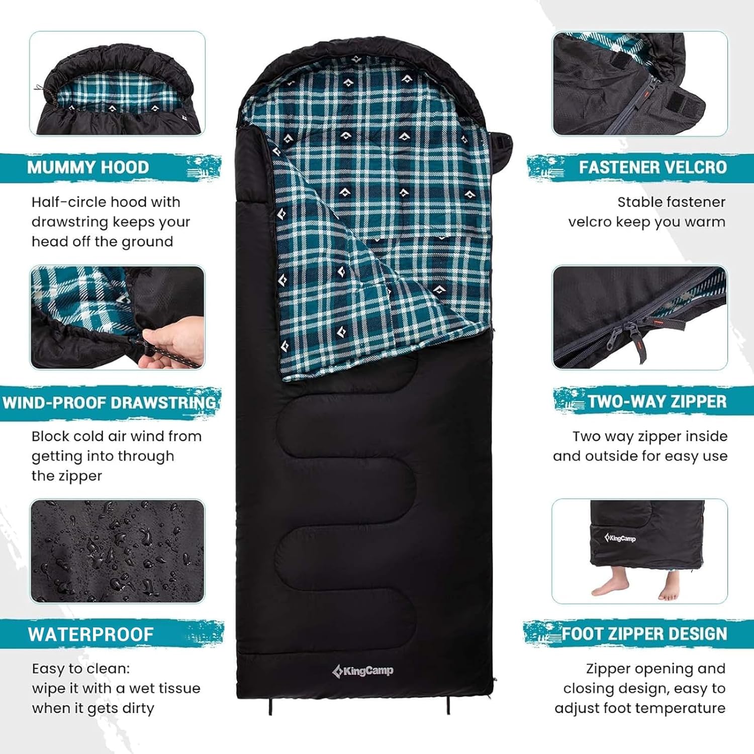 KingCamp Sleeping Bag for Adults, Cold Weather & Warm XL Big and Tall Flannel Sleeping Bags with Compression Sack Portable Waterproof Essentials Gear Accessories for Outdoor Camping