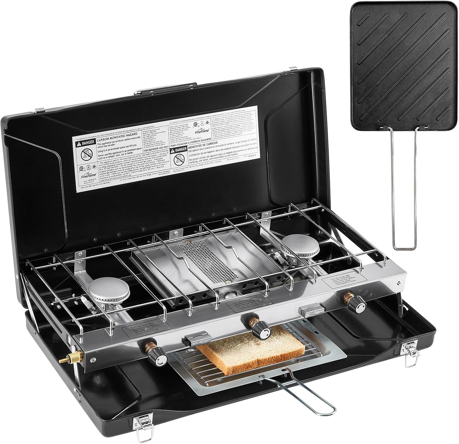 - ADJUSTABLE 2 BURNERS AND TOASTER : This camping stove is equipped with 3 independently adjustable knobs, two of Piezo ignition burners with 6,600 BTU power. The middle downward burner is designed for toasting, 7200BTU power and requires manual ignition. We recommend that you use a piezo lighter. It relies on heat radiation to heat and won't burn the toast