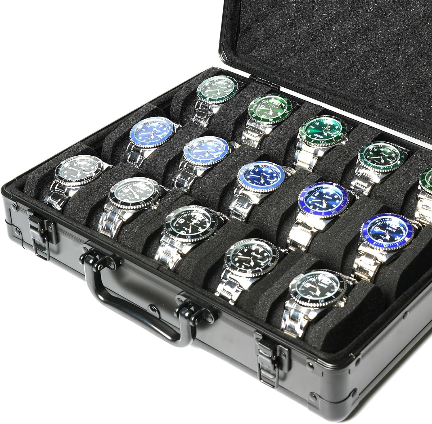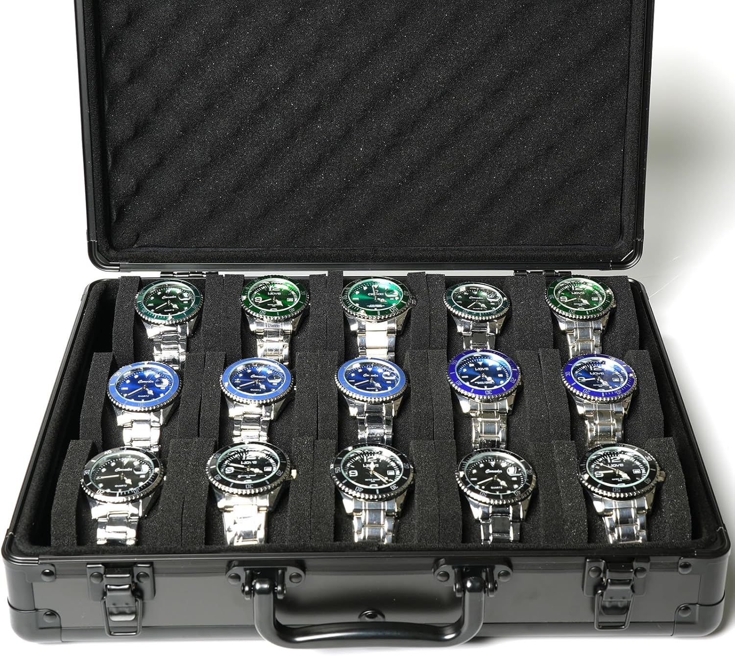 15 slots Watch organizer Case, Aluminum watch storage box, hard watch travel box, padded case for watch display and organization