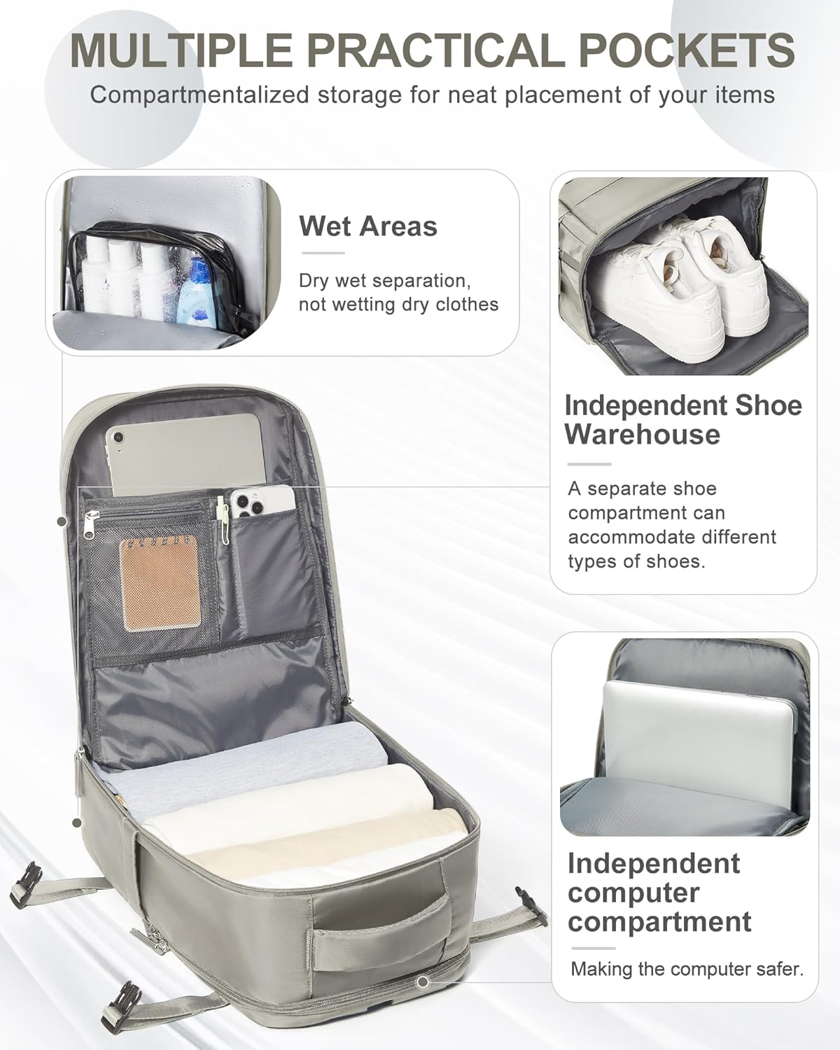 - 【Separate Shoe Compartment Design & Wet Bag】The main compartment of this luggage backpack can be opened 180 degrees, making it convenient for you to place items. Different pockets have different purposes. The wet bag is made of high density water resistant material can help you to separate dry items and wet items,if you have wet clothes or towel,you can put it in wet bag. A separate shoe compartment can help you carry and keep your shoes better in your travel bag.