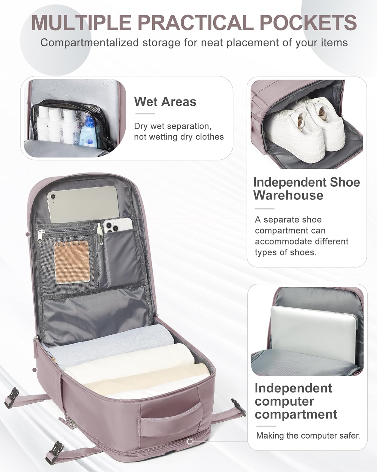 - 【Separate Shoe Compartment Design & Wet Bag】The main compartment of this luggage backpack can be opened 189 degrees, making it convenient for you to place items. Different pockets have different purposes. The wet bag is made of high density water resistant material can help you to separate dry items and wet items,if you have wet clothes or towel,you can put it in wet bag. A separate shoe compartment can help you carry and keep your shoes better in your travel bag.