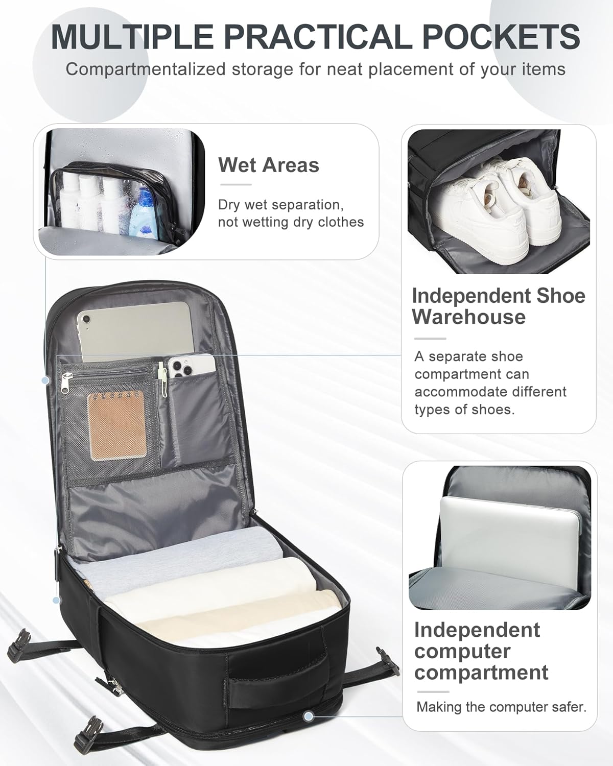 - 【Separate Shoe Compartment Design & Wet Bag】The main compartment of this luggage backpack can be opened 180 degrees, making it convenient for you to place items. Different pockets have different purposes. The wet bag is made of high density water resistant material can help you to separate dry items and wet items,if you have wet clothes or towel,you can put it in wet bag. A separate shoe compartment can help you carry and keep your shoes better in your travel bag.